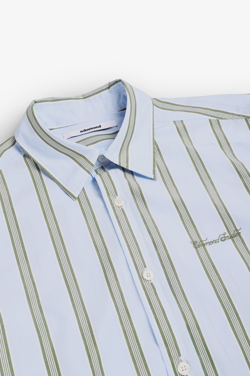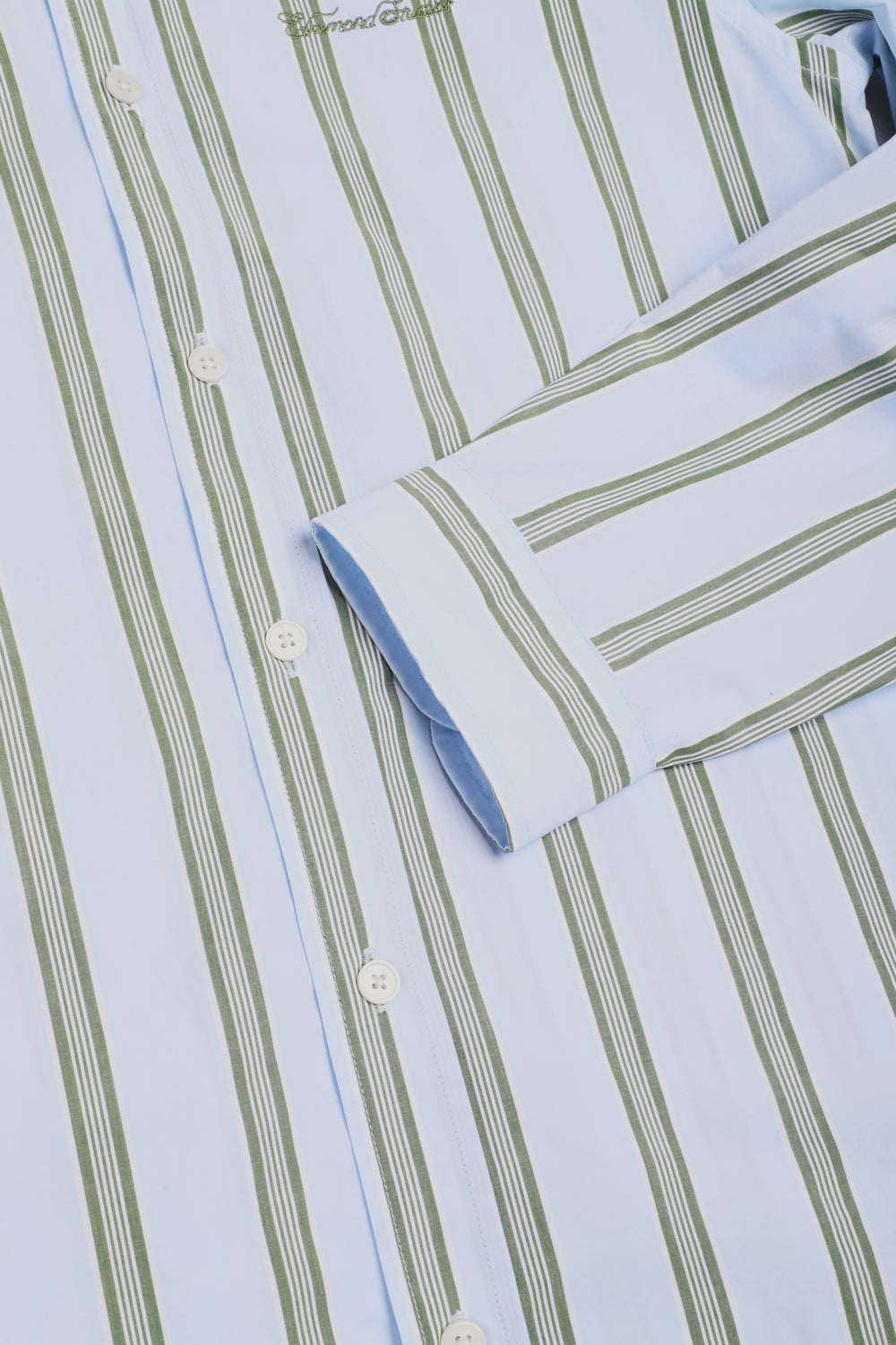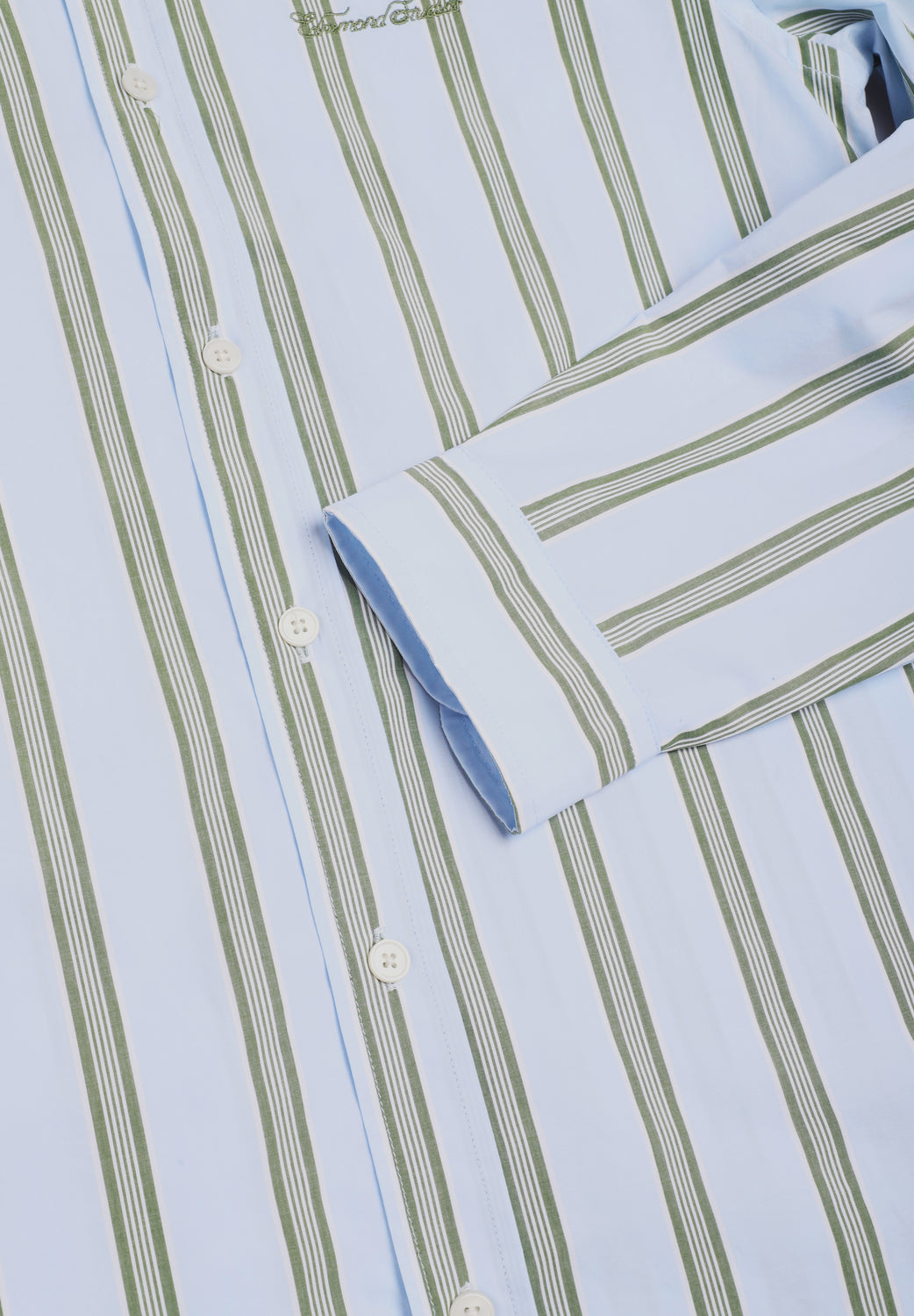 Camisa Edmmond Studios confeccionada en 100% algodón. Diseñada en popelín de algodón en patrón de rayas azul claro y verde, presenta un cuello button down, mangas largas con puños abotonados, bolsillo en el pecho, cierre frontal con botones y logo de la marca bordado en el pecho.