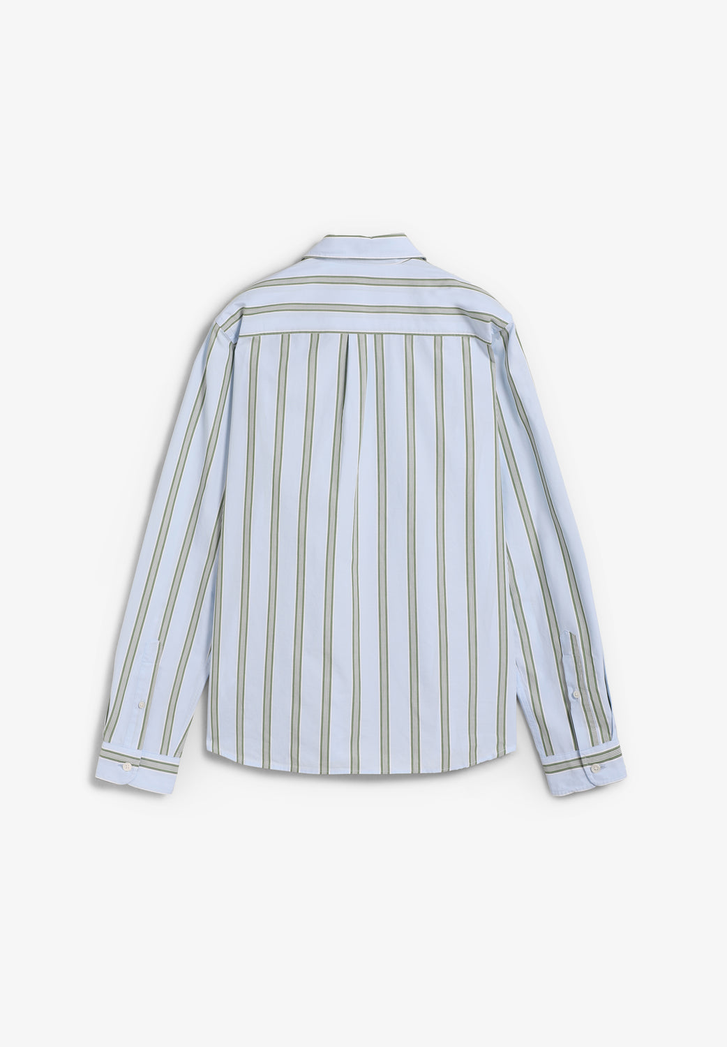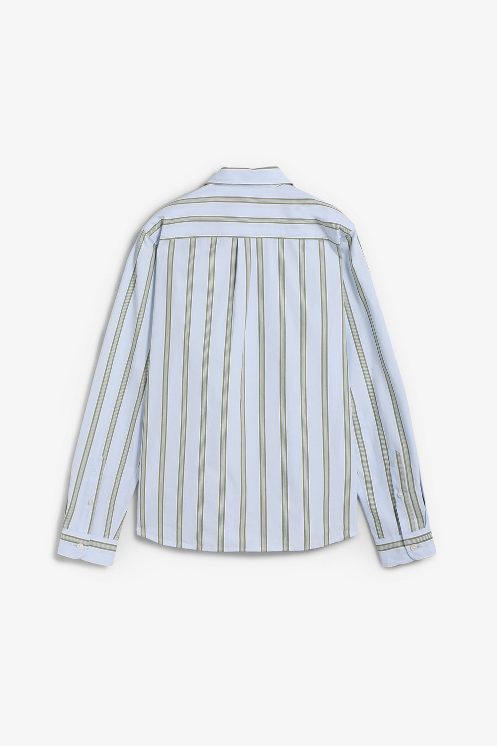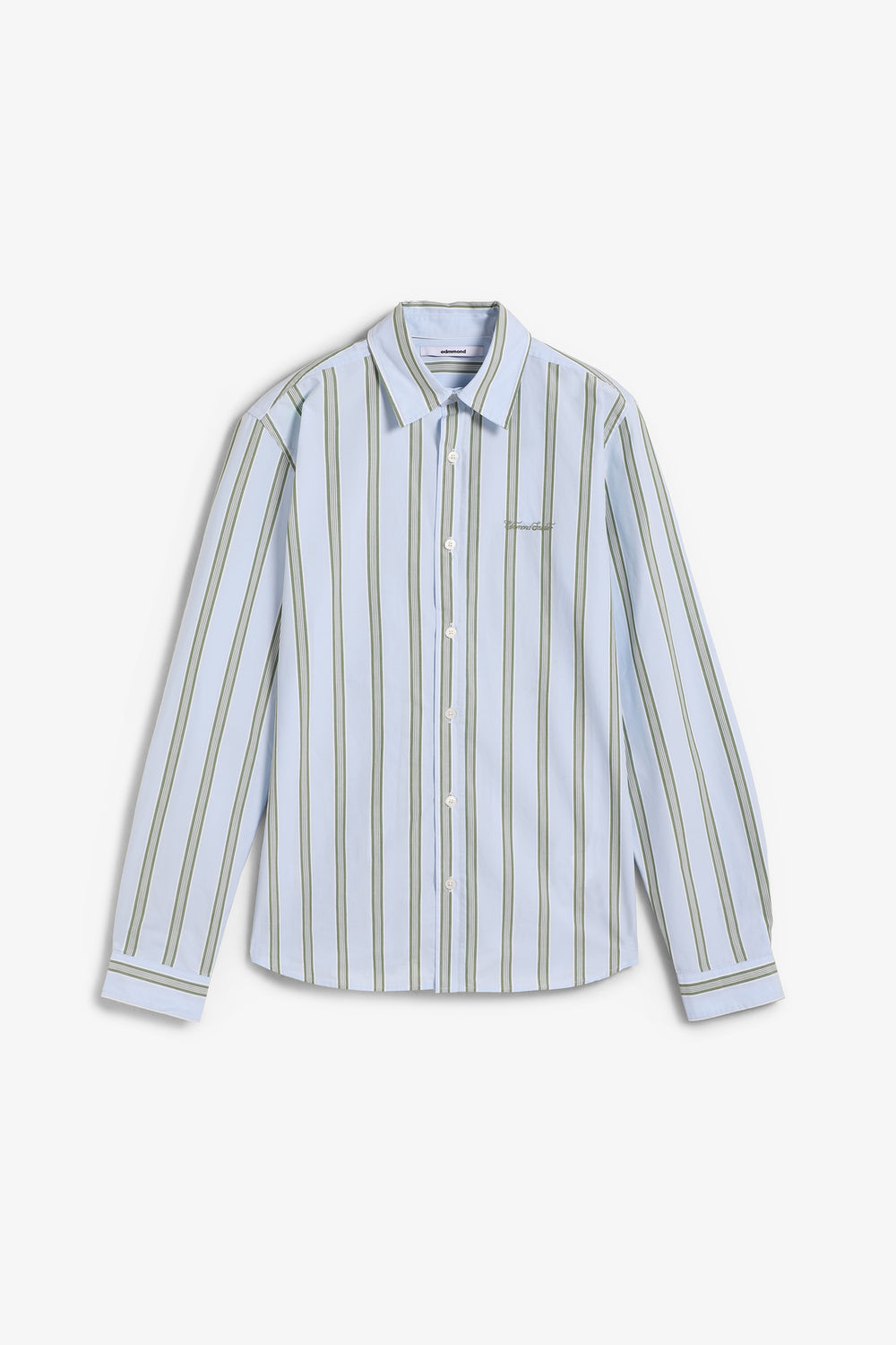 Camisa Edmmond Studios confeccionada en 100% algodón. Diseñada en popelín de algodón en patrón de rayas azul claro y verde, presenta un cuello button down, mangas largas con puños abotonados, bolsillo en el pecho, cierre frontal con botones y logo de la marca bordado en el pecho.