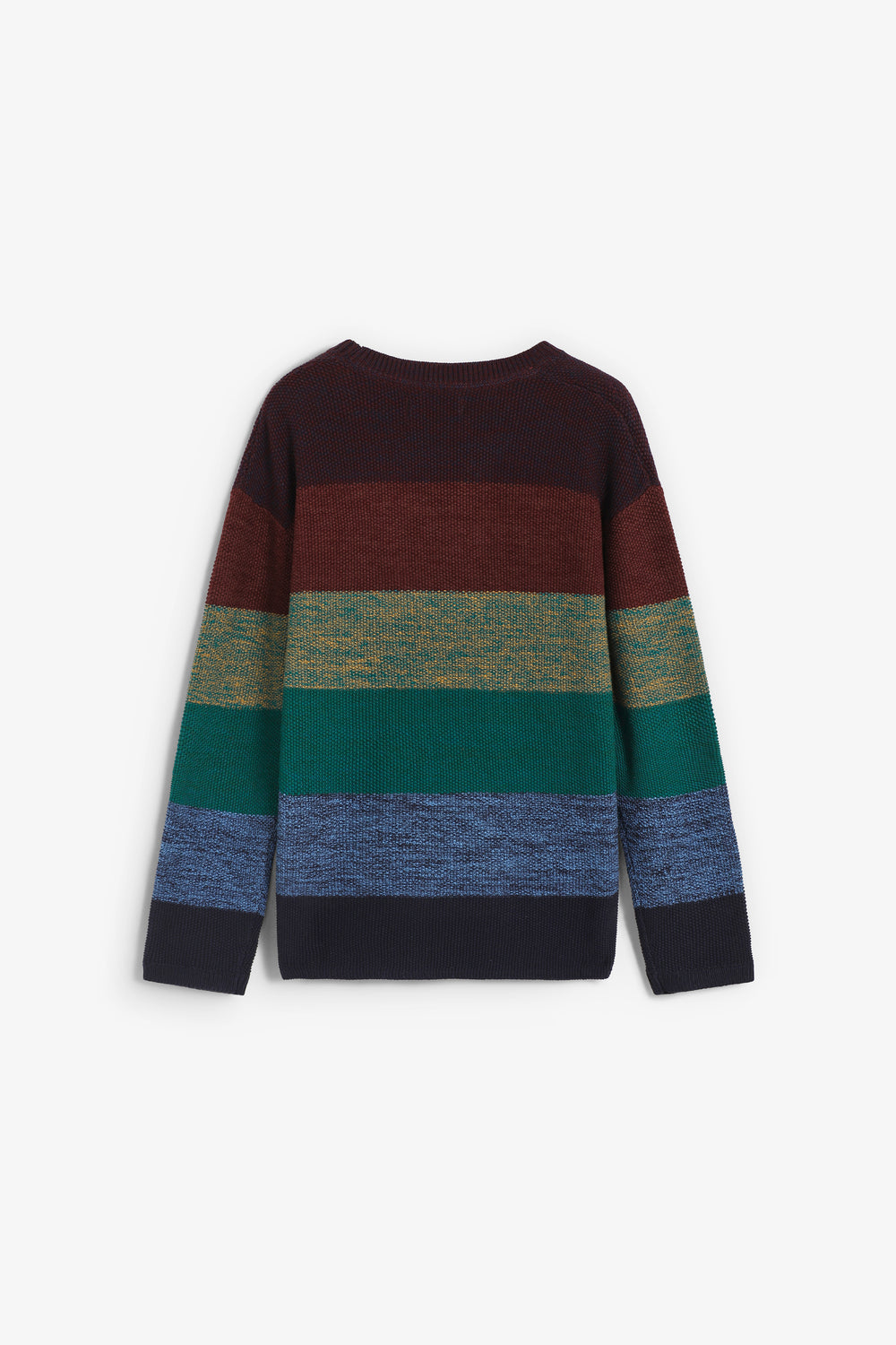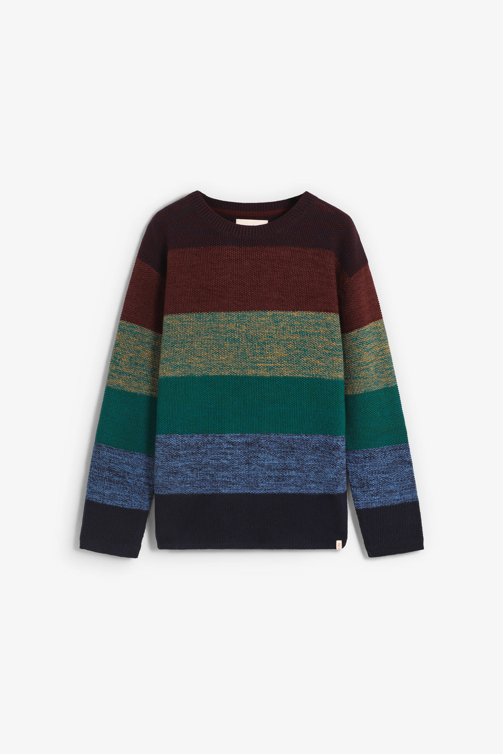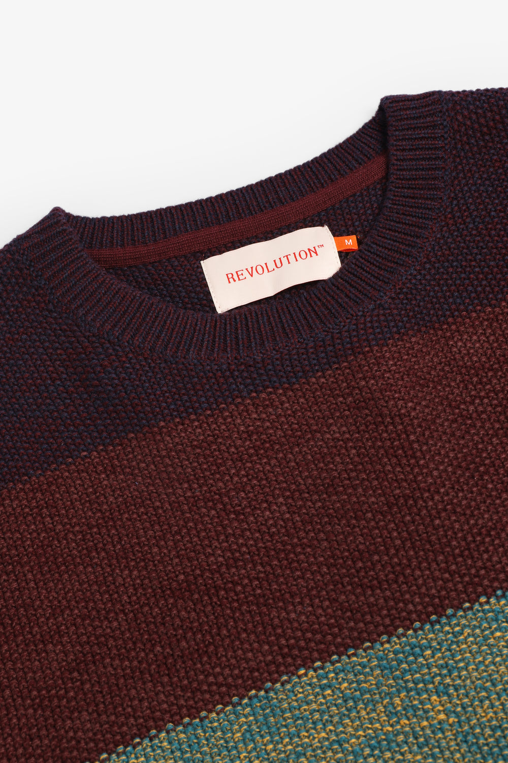 Jersey Revolution confeccionado en 100% algodón orgánico. Presenta un estampado de rayas anchas multicolor en vibrantes tonos de temporada, corte holgado y bordes acanalados.