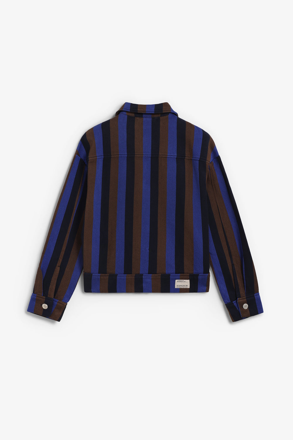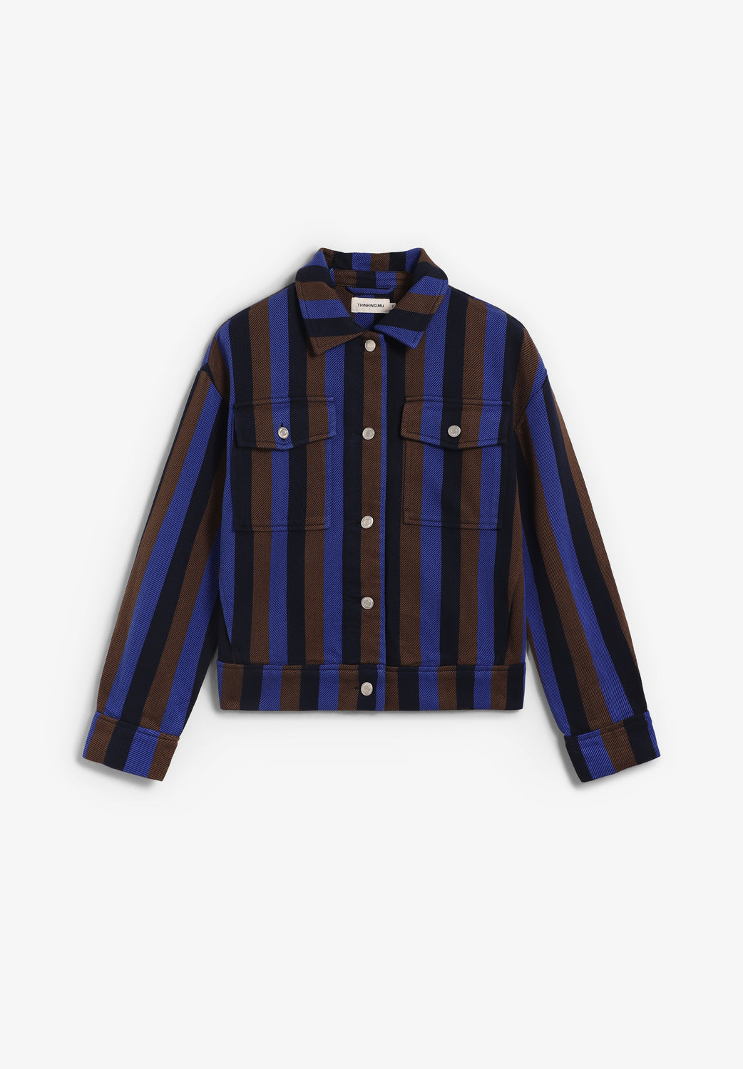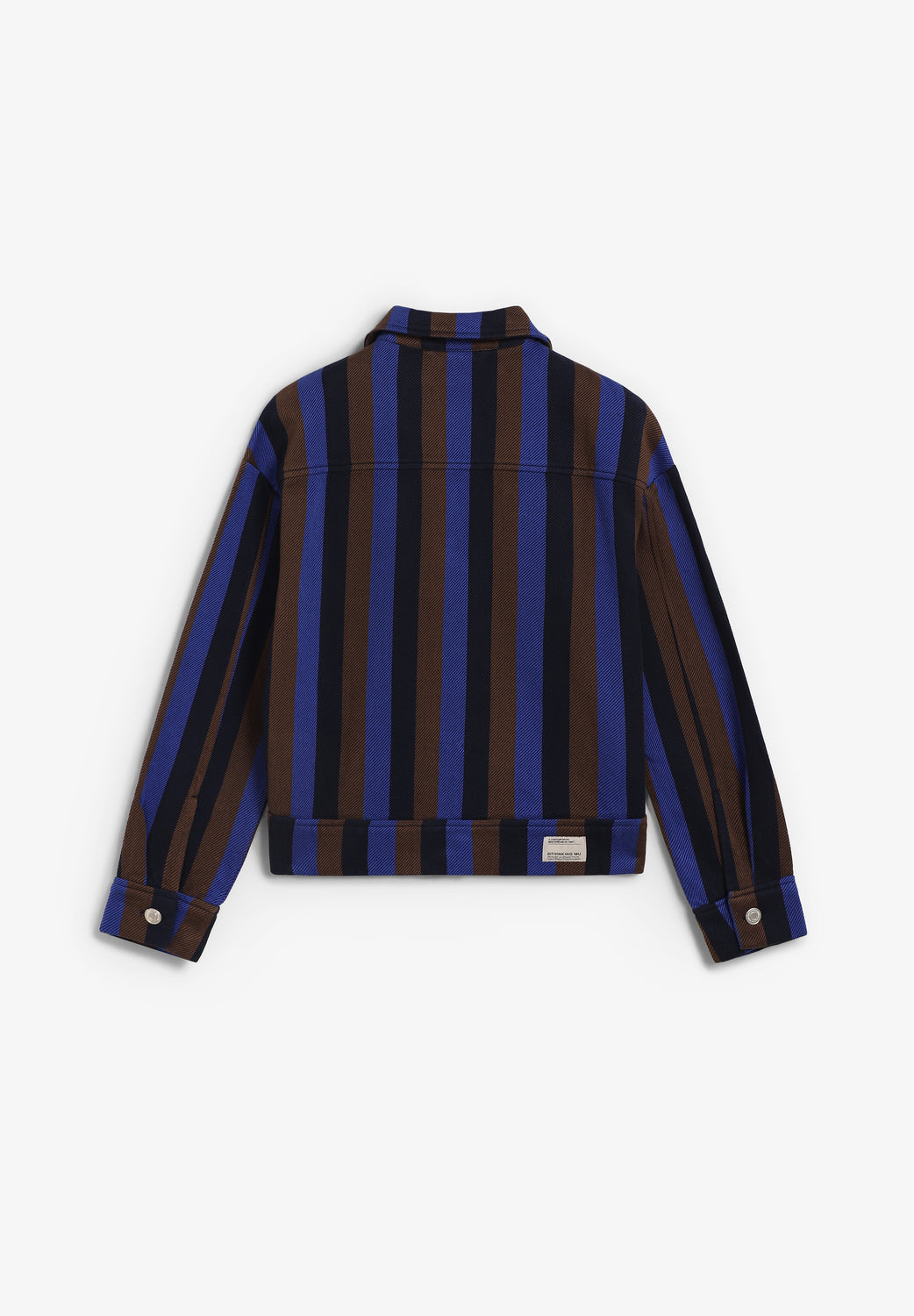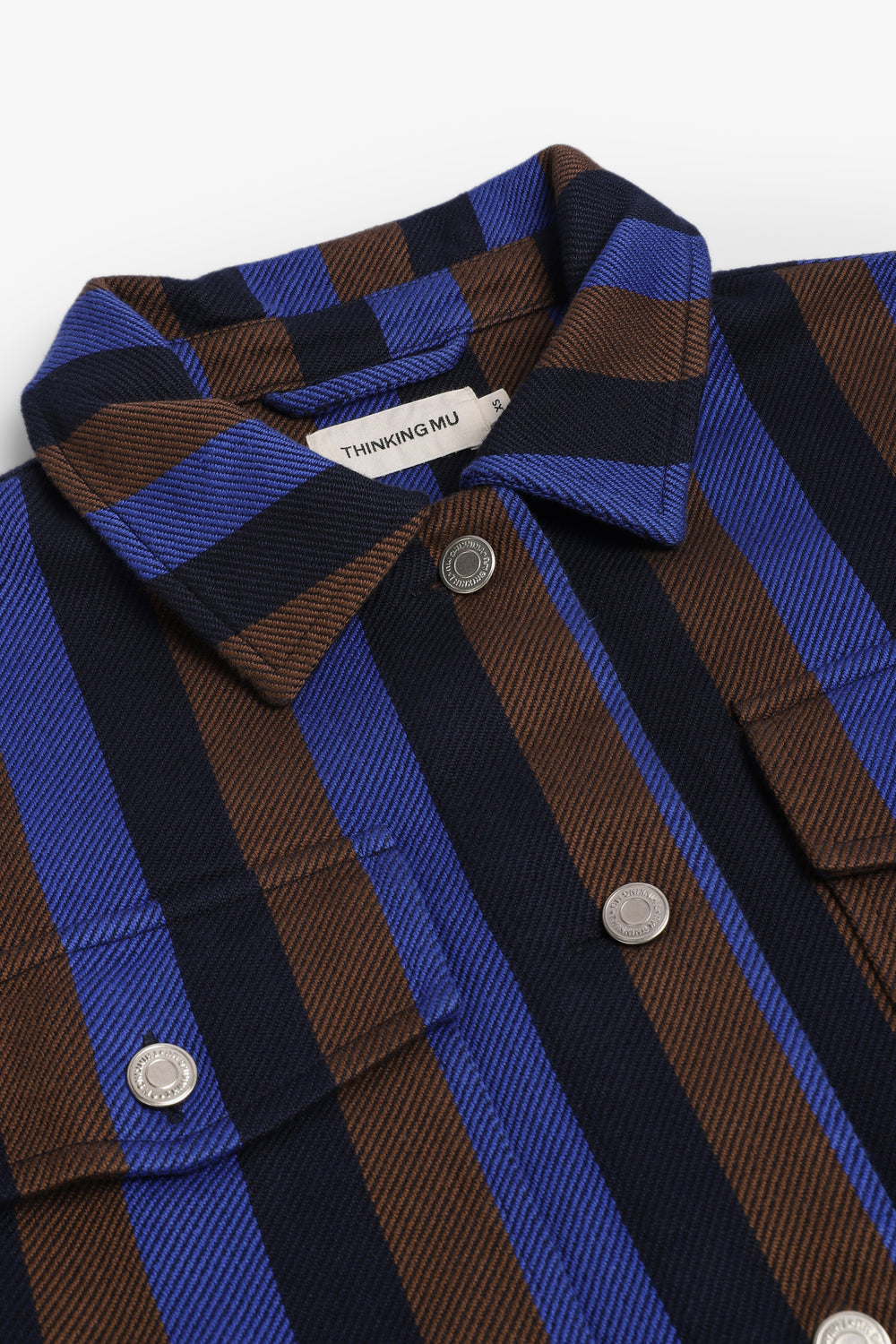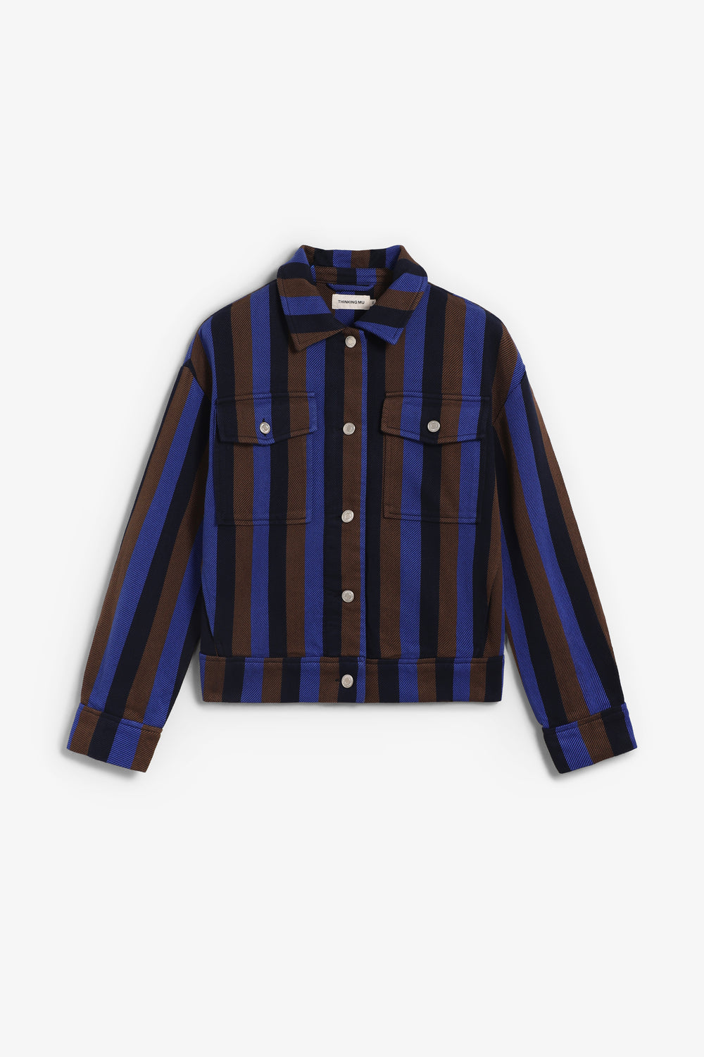 Chaqueta Thinking Mu confeccionada en 100% algodón orgánico. Presenta cuello camisero, mangas largas y corte relajado. Cierre con botones en la parte delantera y bolsillos de parche delanteros con solapa y bolsillo laterales.