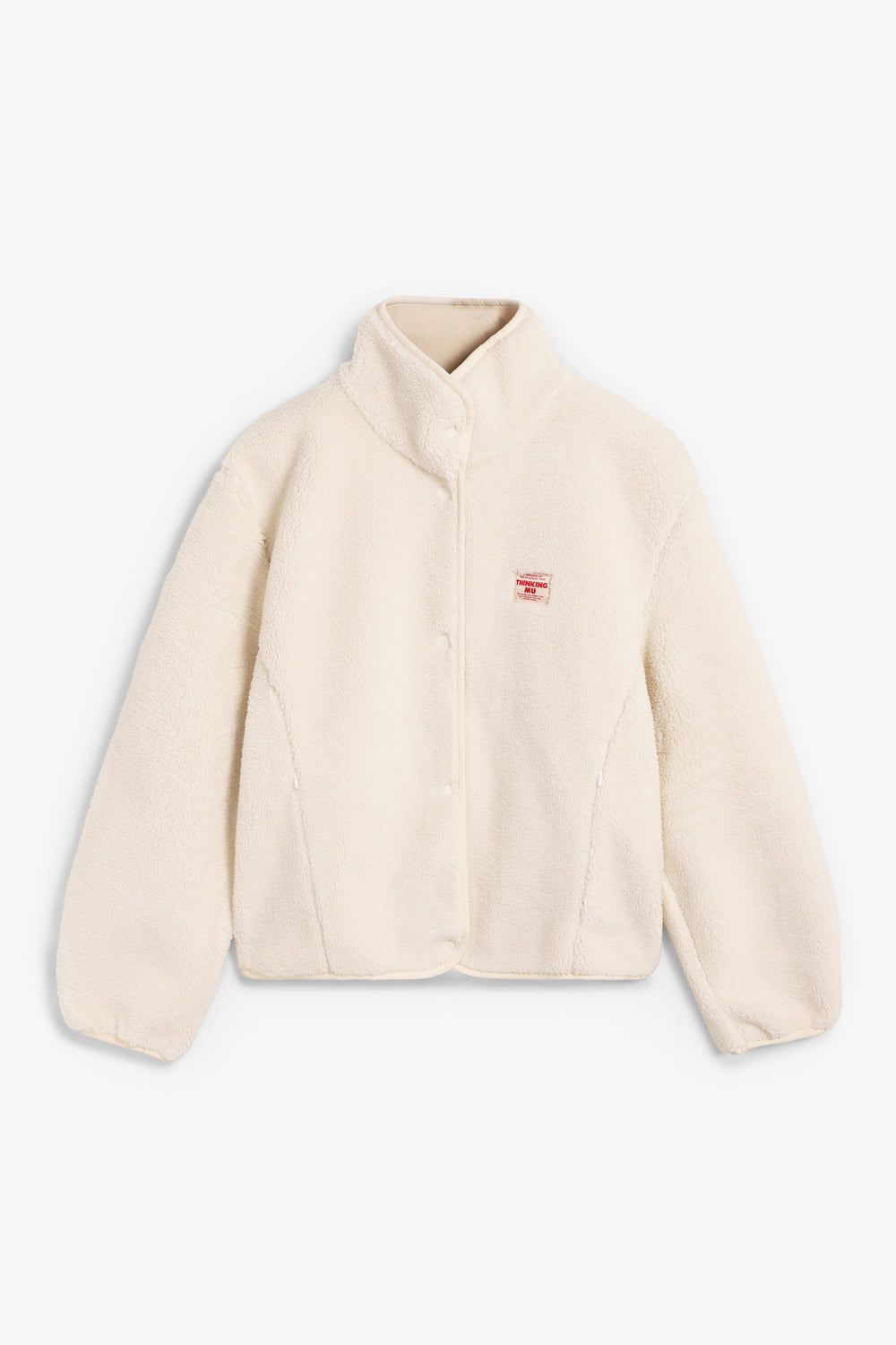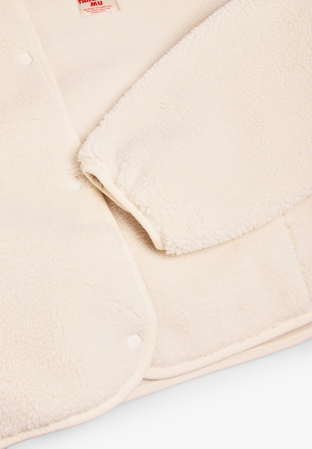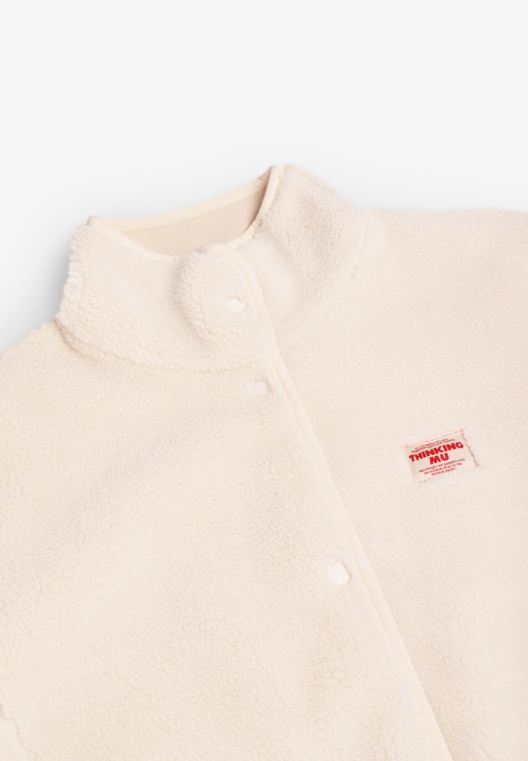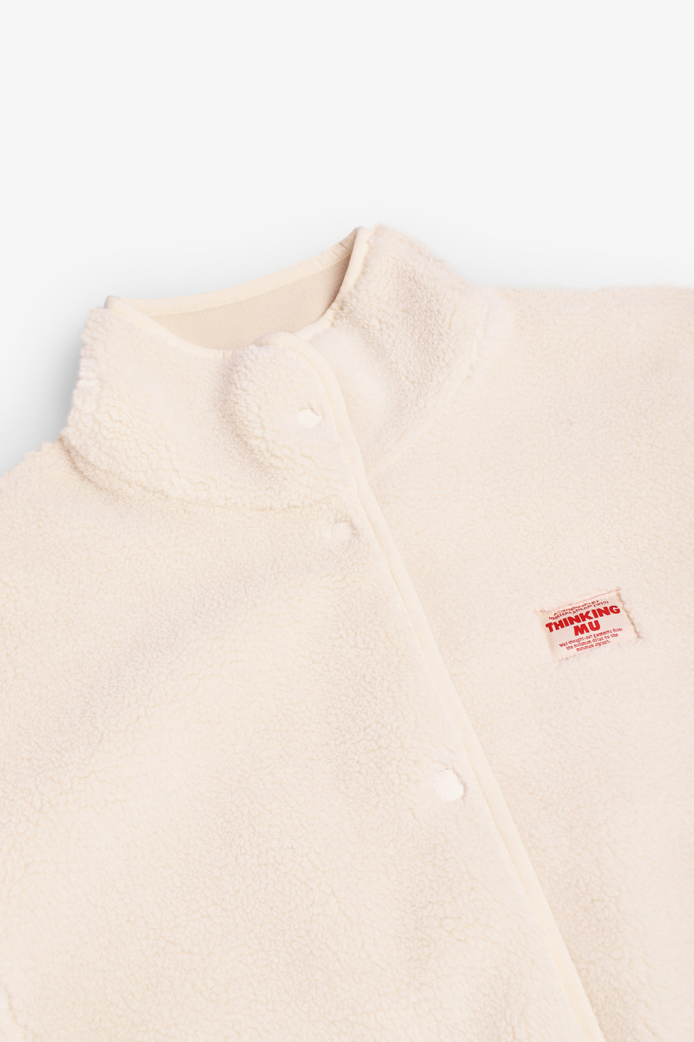 Chaqueta Thinking Mu confeccionada en 100% poliéster reciclado. Presenta cuello alto, mangs lrgas, ajuste relajado y cierre frontal con botones a presión.