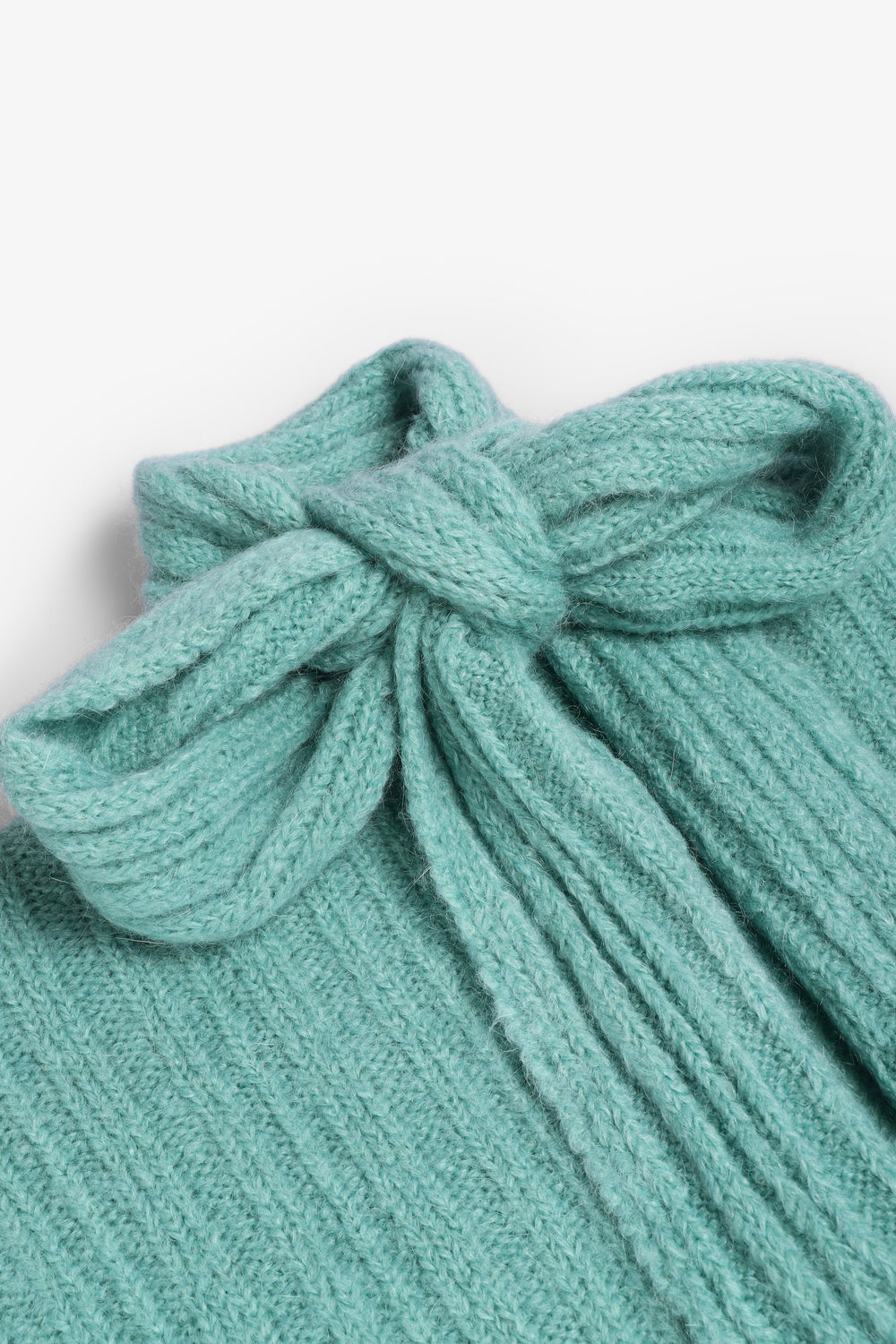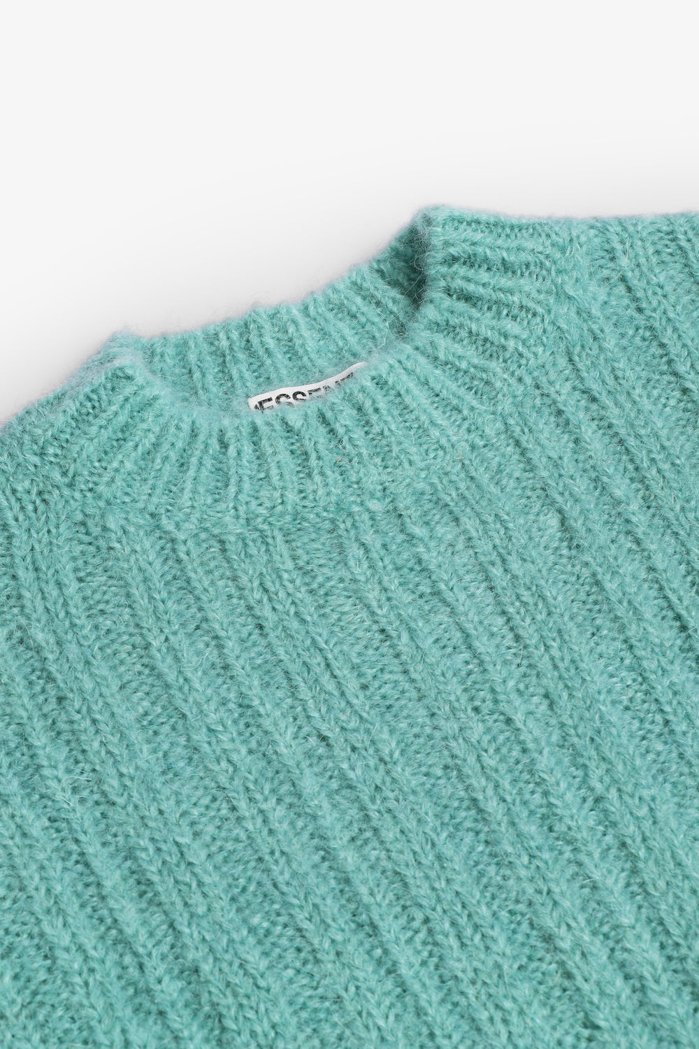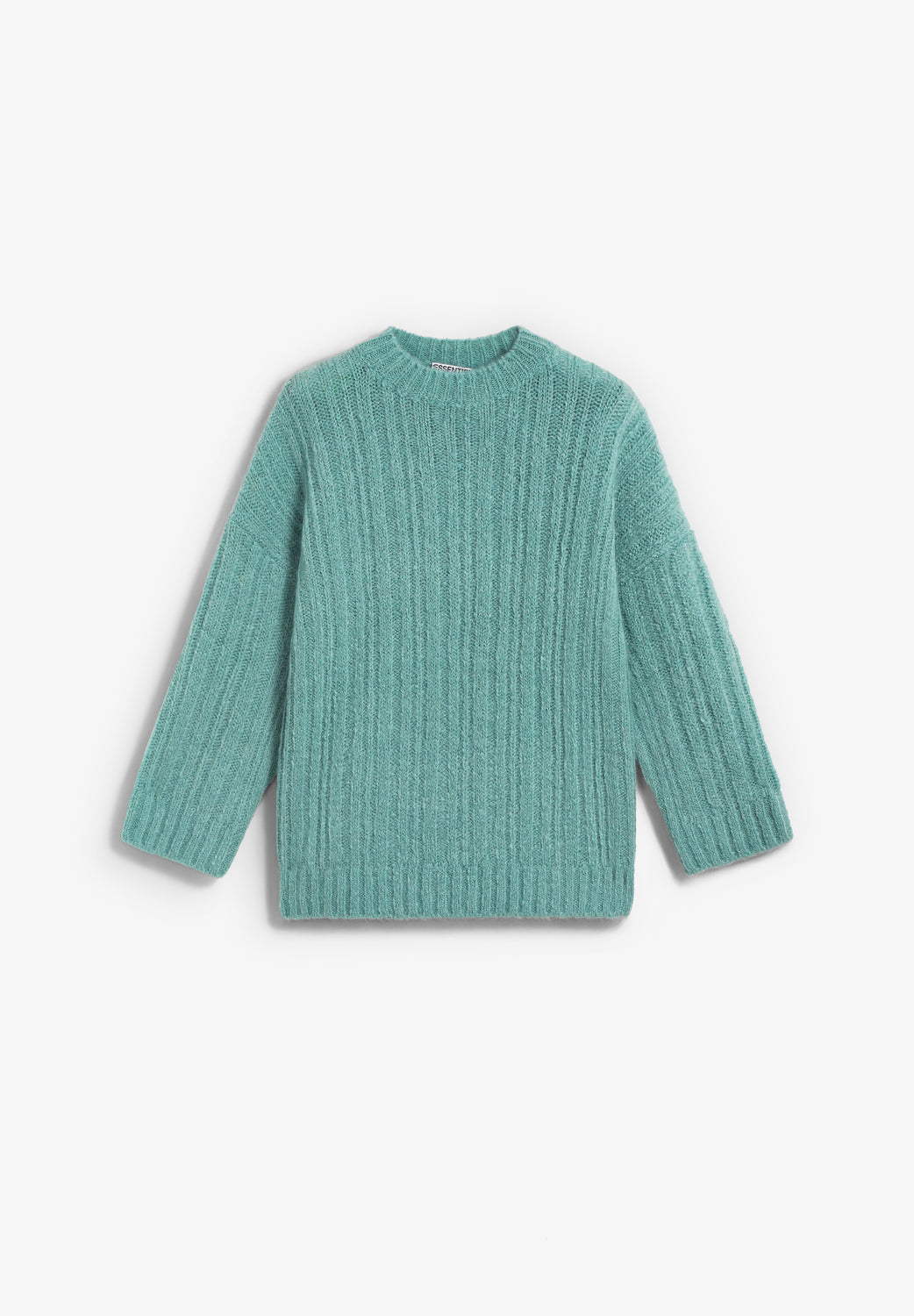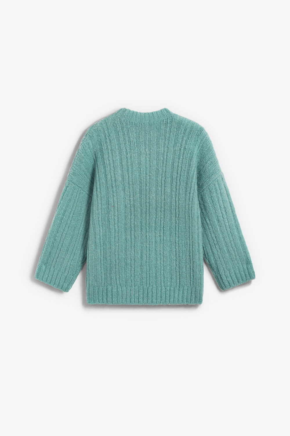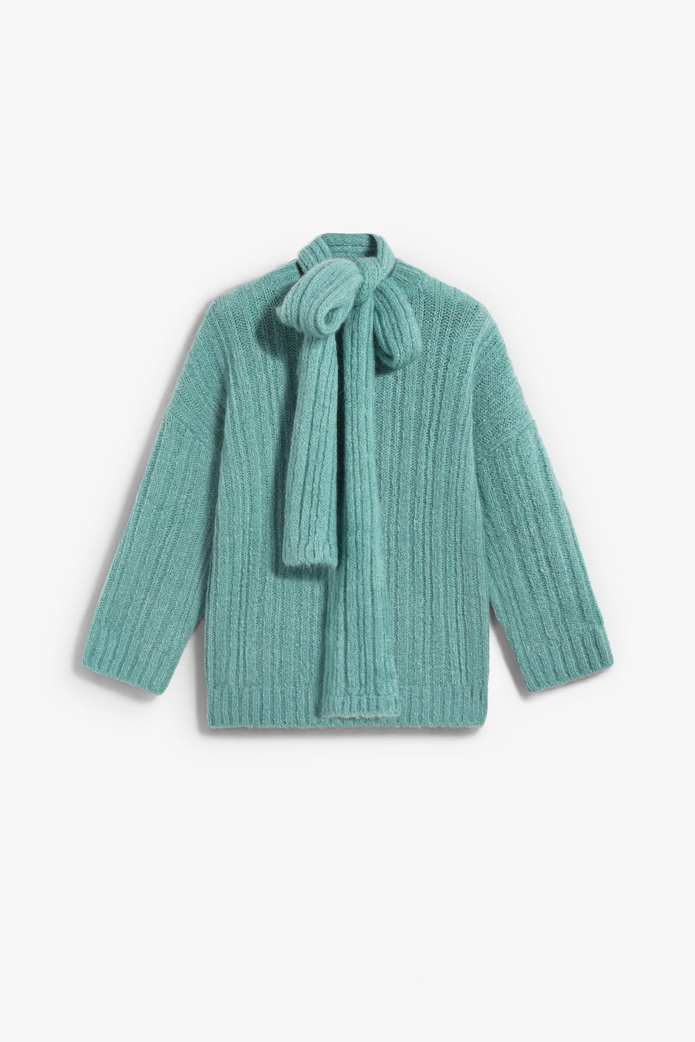 Jersey Essentiel confeccionado en 50% mohair, 37% acrílico, 11% poliamida y 2% elastano. Presenta una silueta relajada, hombros caídos, aberturas ligeramente más anchas en las mangas y elegantes ribetes acanalados. Detalle lazo de tela.