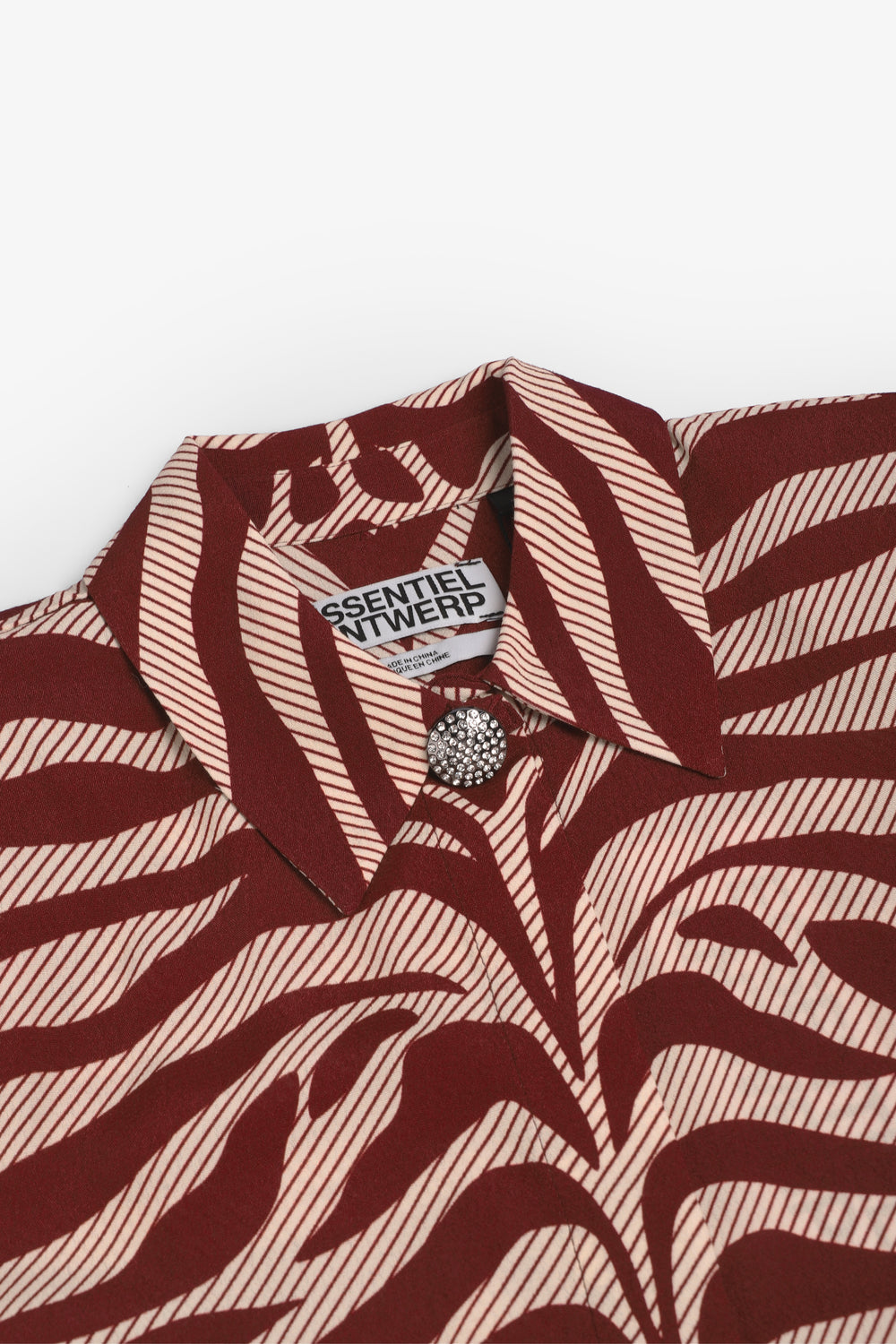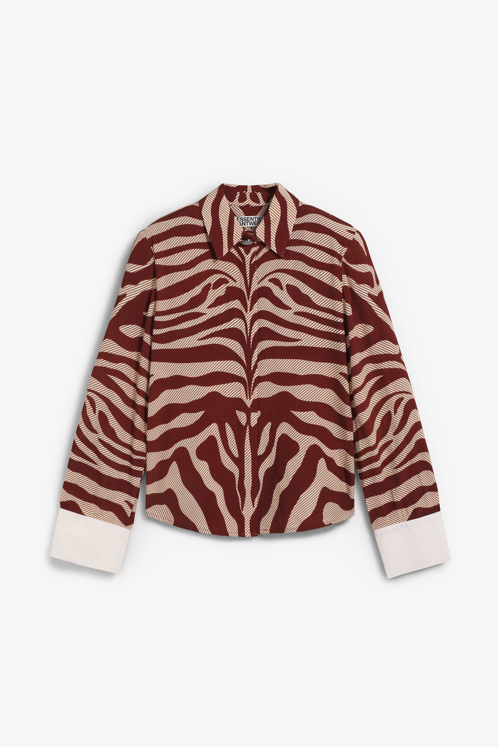 Camisa Essentiel confeccionada en mezcla de tejidos: 53% viscosa, 47% viscosa-Lenzing™ Ecovero™. Presenta un corte oversize, hombreras extraíbles, tapeta adornada con un botón con pedrería incrustada en el cuello y rematada con un dobladillo redondeado. Cierre con botones.