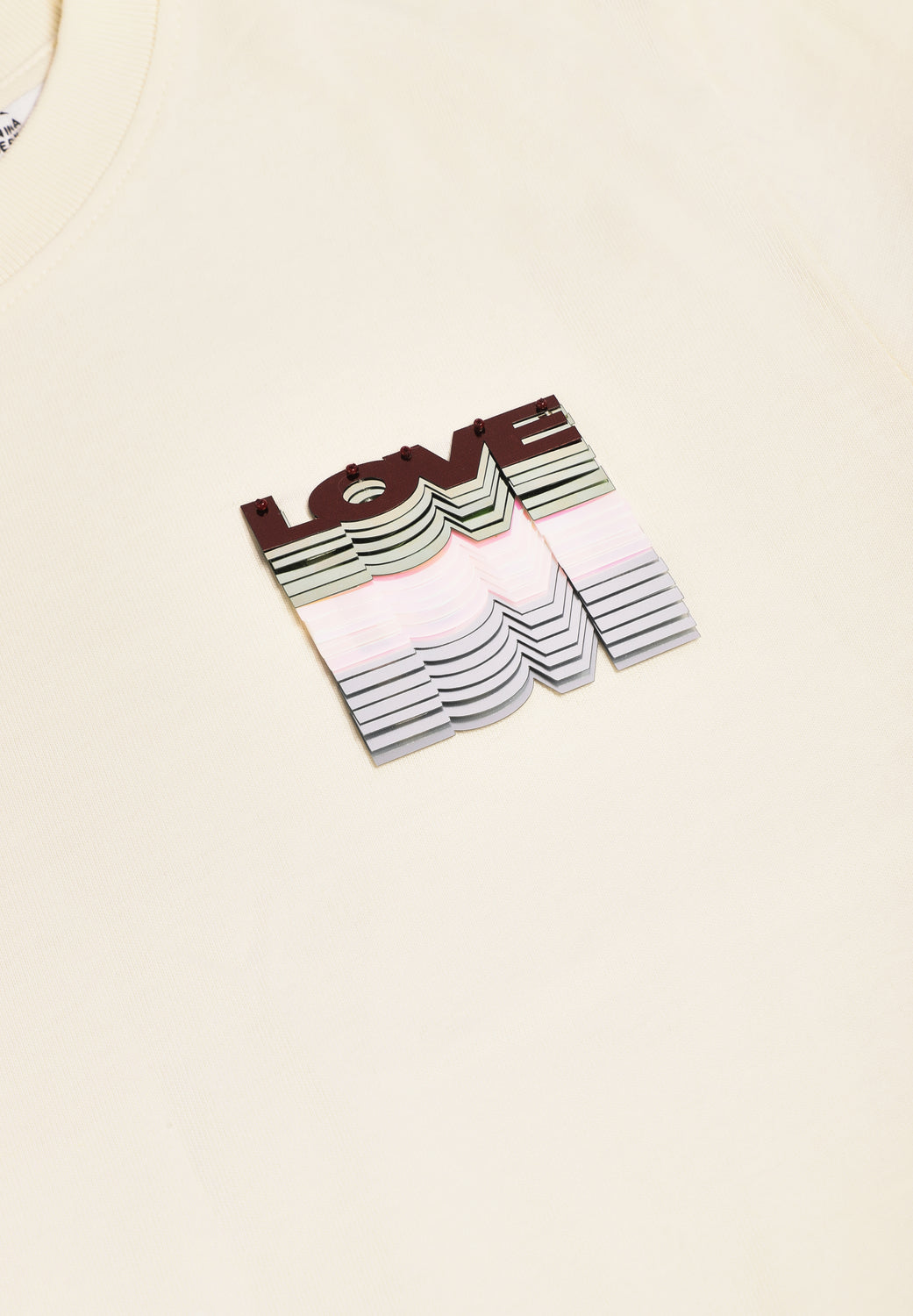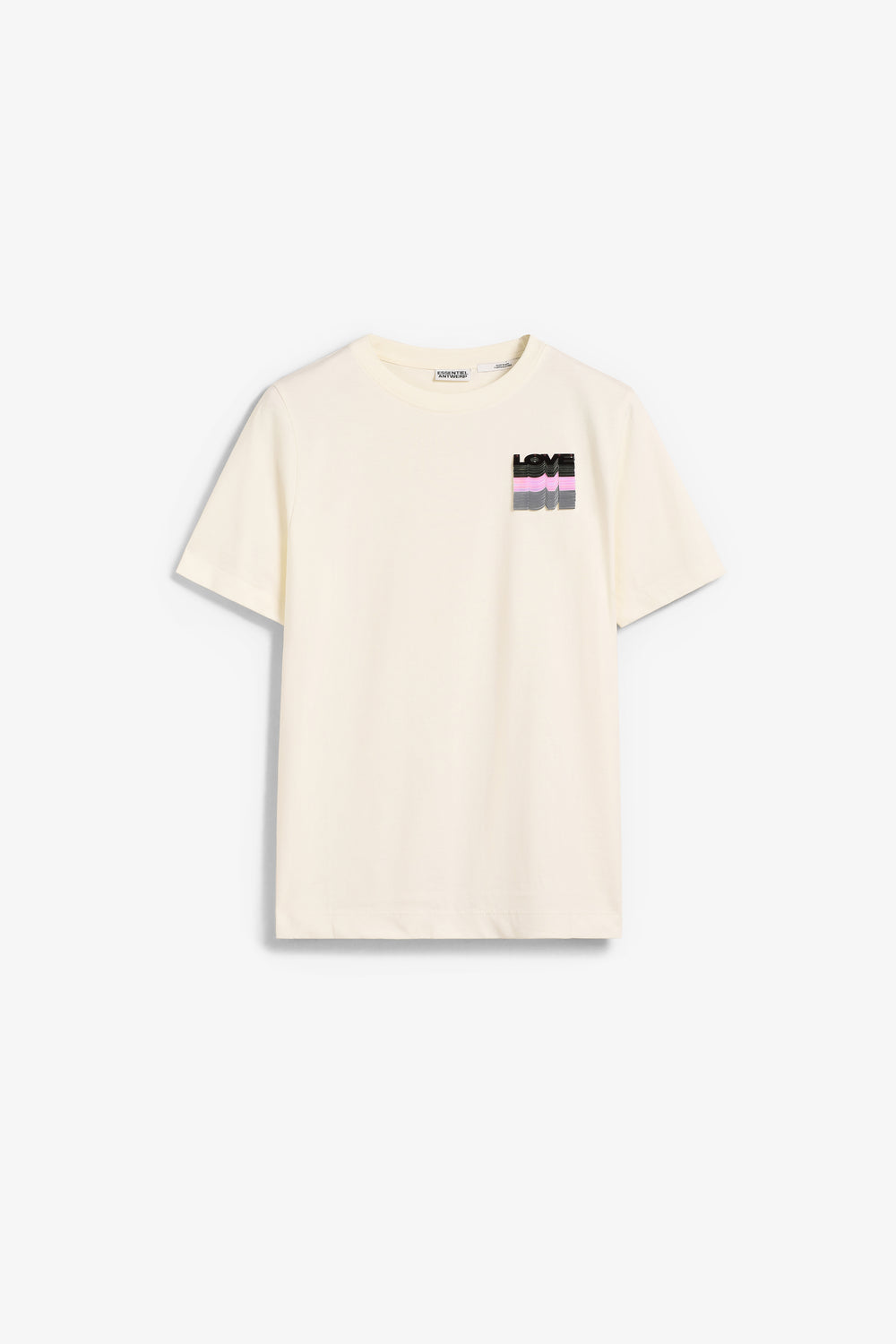 Camiseta Essentiel confeccionada en 100% algodón, con cuello redondo clásico, ajuste relajado y bordado de lentejuelas con la palabra "love" en el pecho.