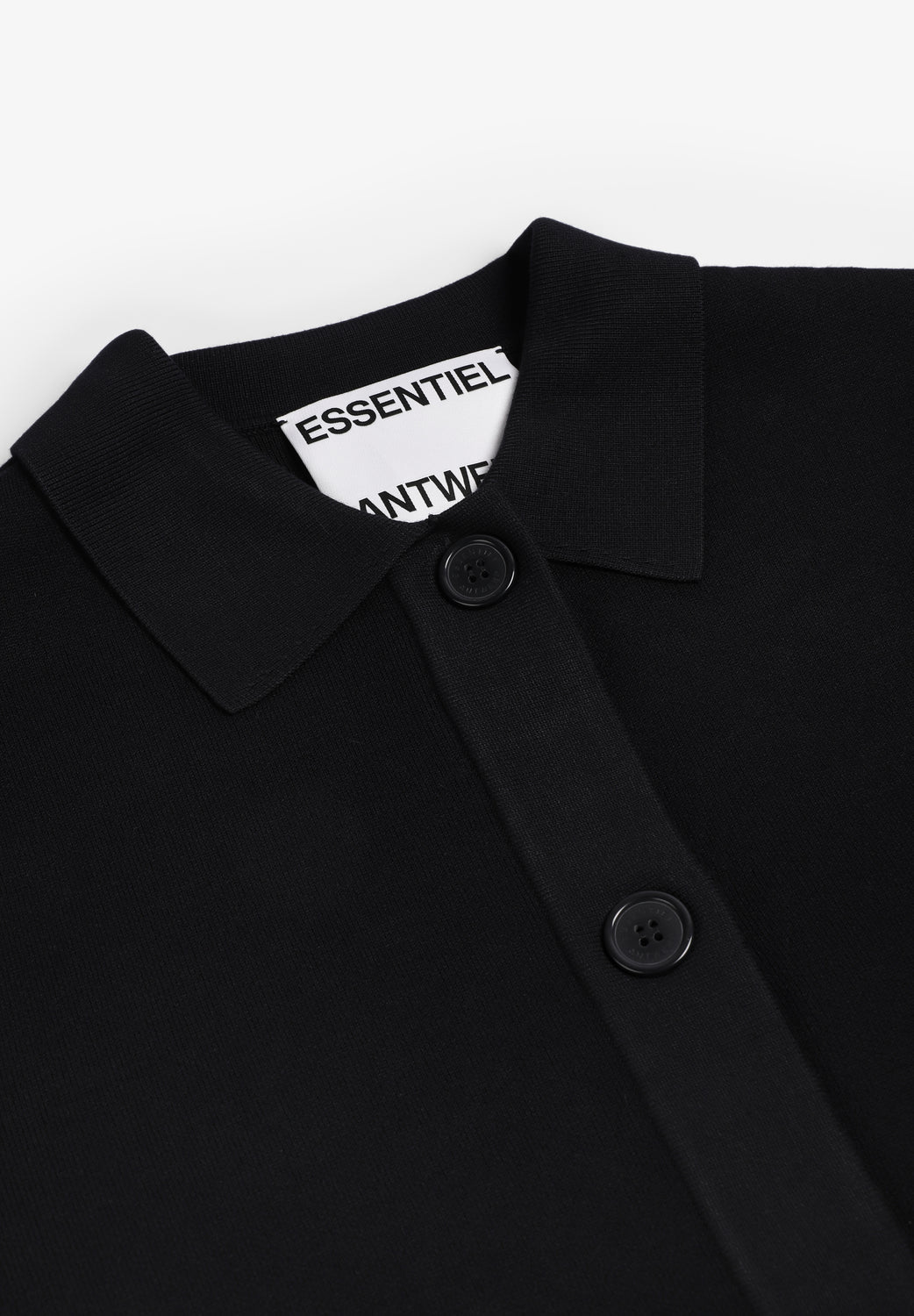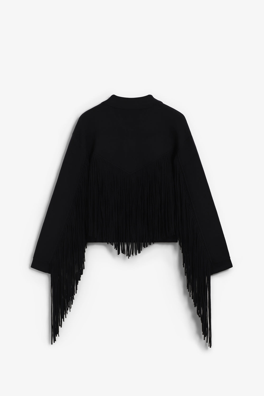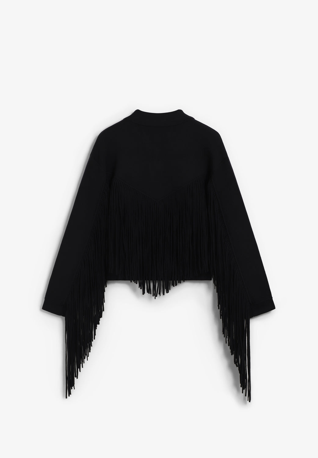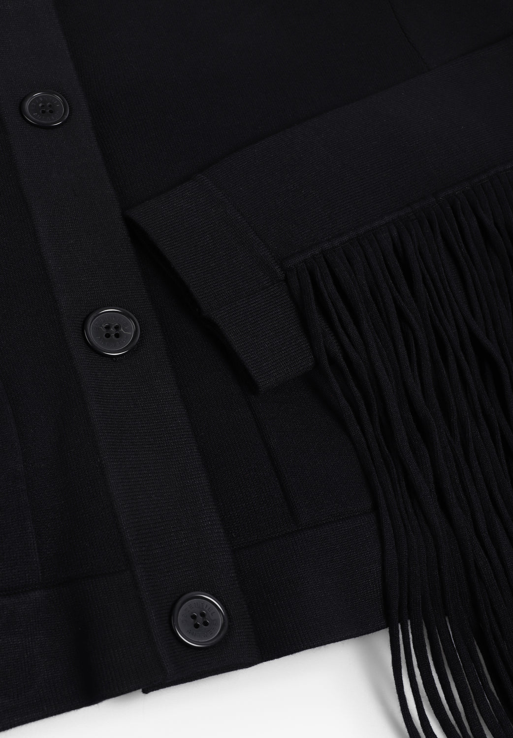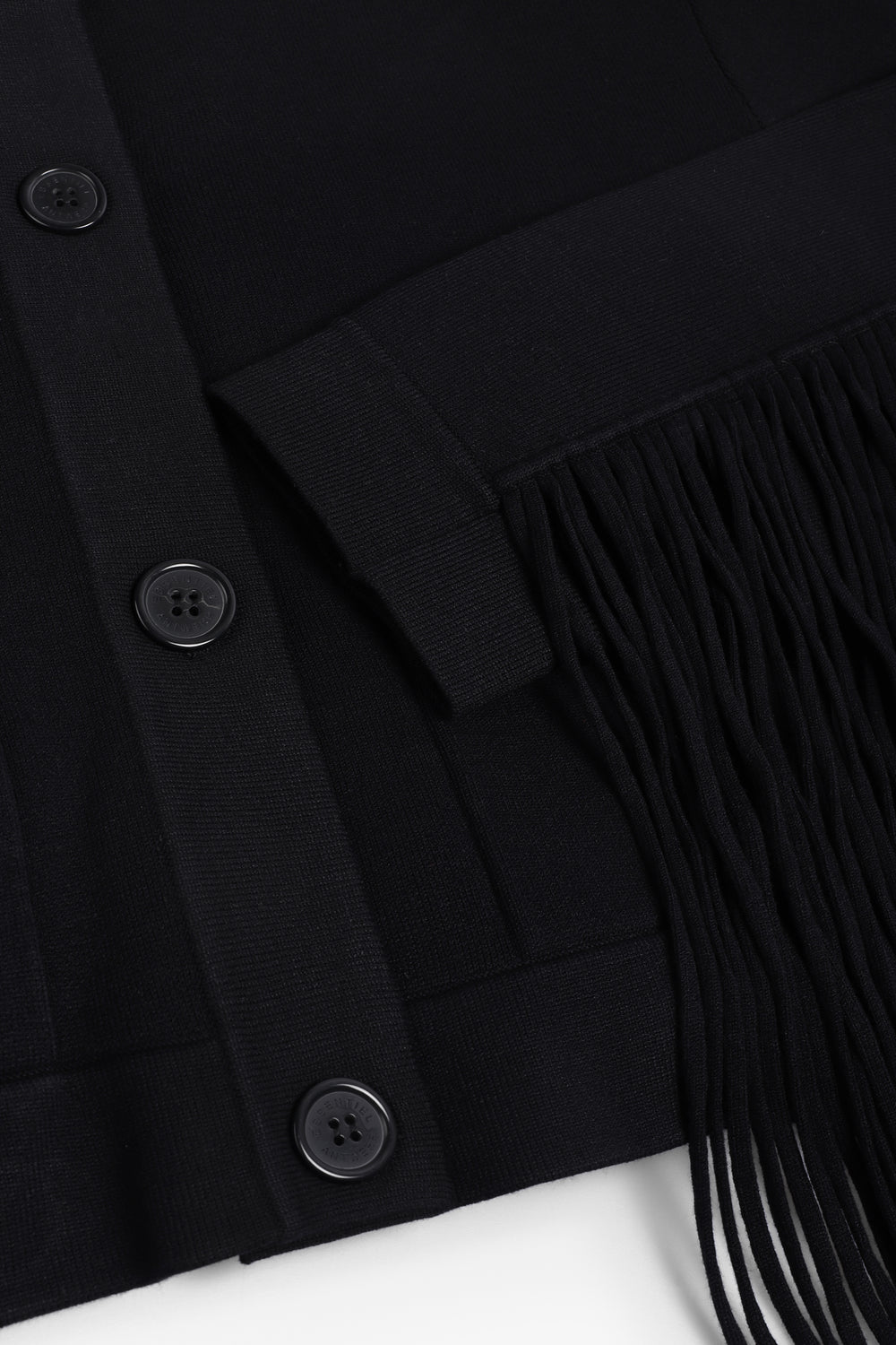 Cardigan Essentiel confeccionado en mezcla de tejidos: 43% viscosa, 25% poliéster, 24% poliéster reciclado y 7% poliamida. Diseñado con hombros caídos para complementar la silueta de corte relajado, corte cropped, dos bolsillos de parche y cierre con botones del mismo tono. Flecos en la parte trasera que añaden movimiento y fluidez a la prenda.