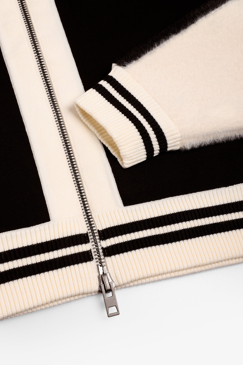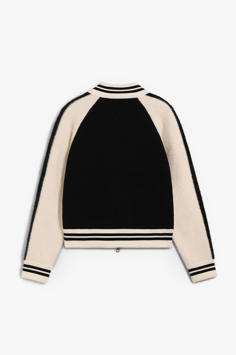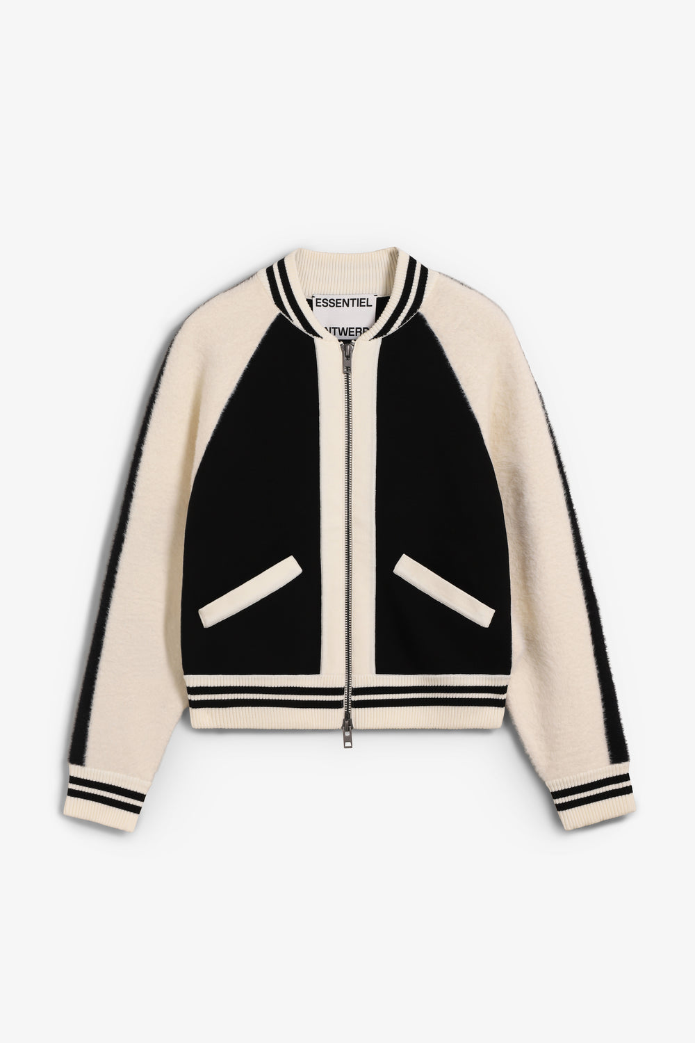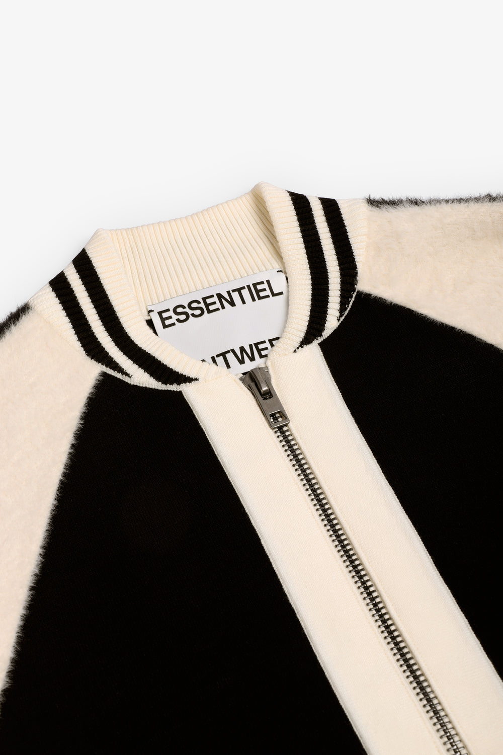 Chaqueta bomber Essentiel confeccionado en mezcla de tejidos: 49% poliamida, 27% viscosa, 16% poliéster y 8% poliéster reciclado. Presenta un tacto suave y cuenta con paneles de piel sintética mullida que recorre mangas y cuerpo. Corte relajado, hombros raglán y cierre con cremallera gruesa en la parte delantera. Detalle de ribetes de canalé a rayas.