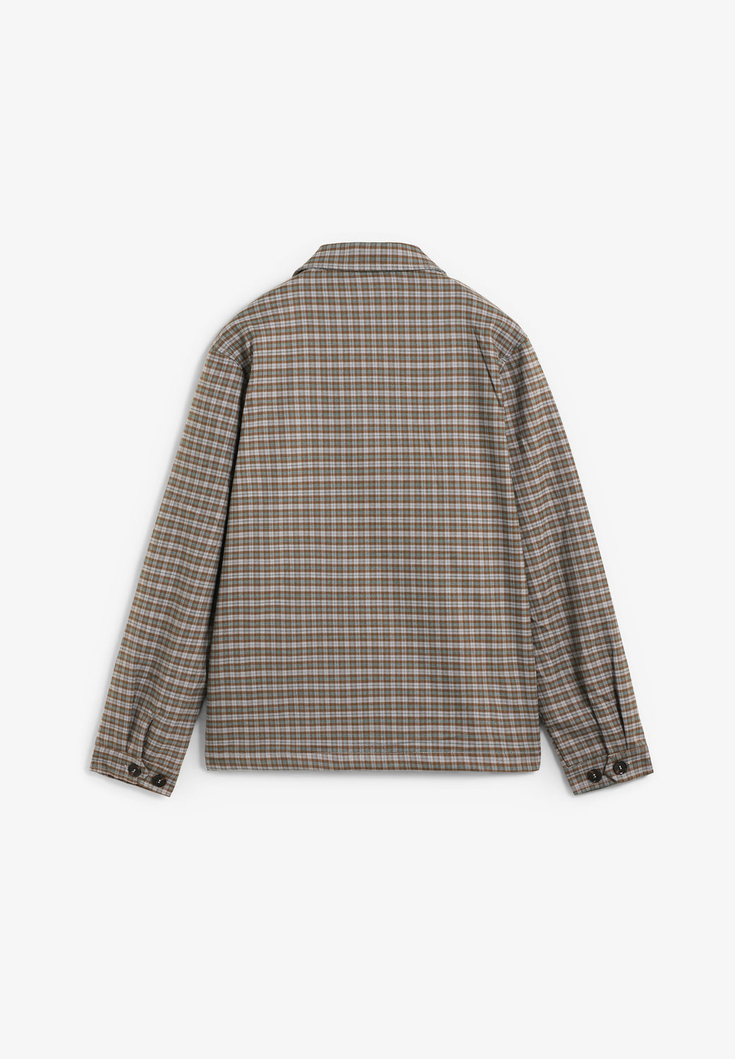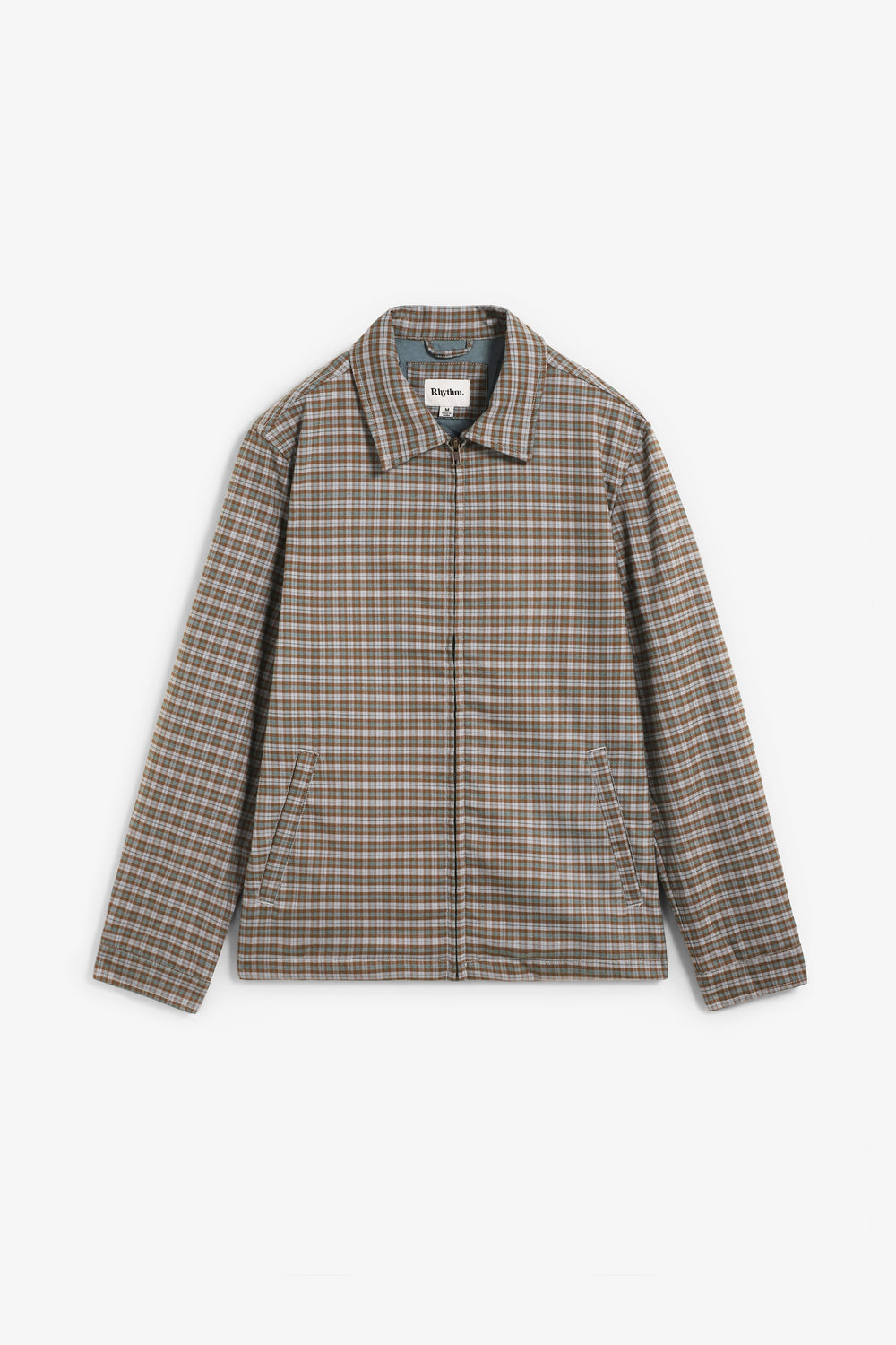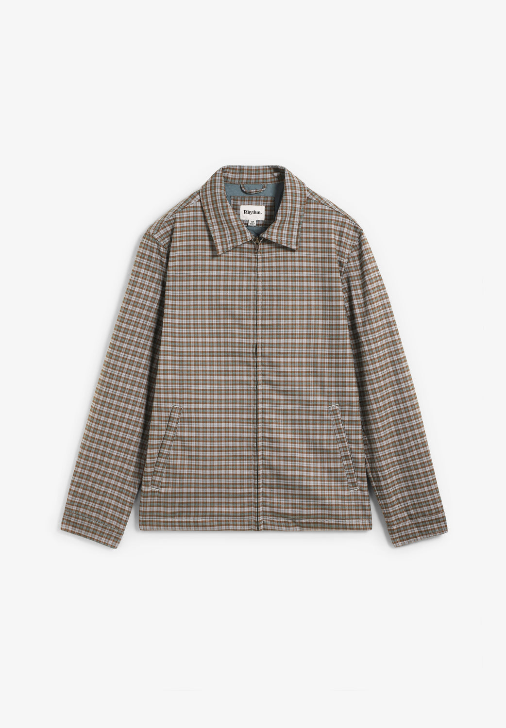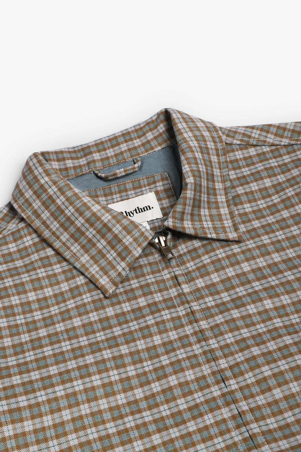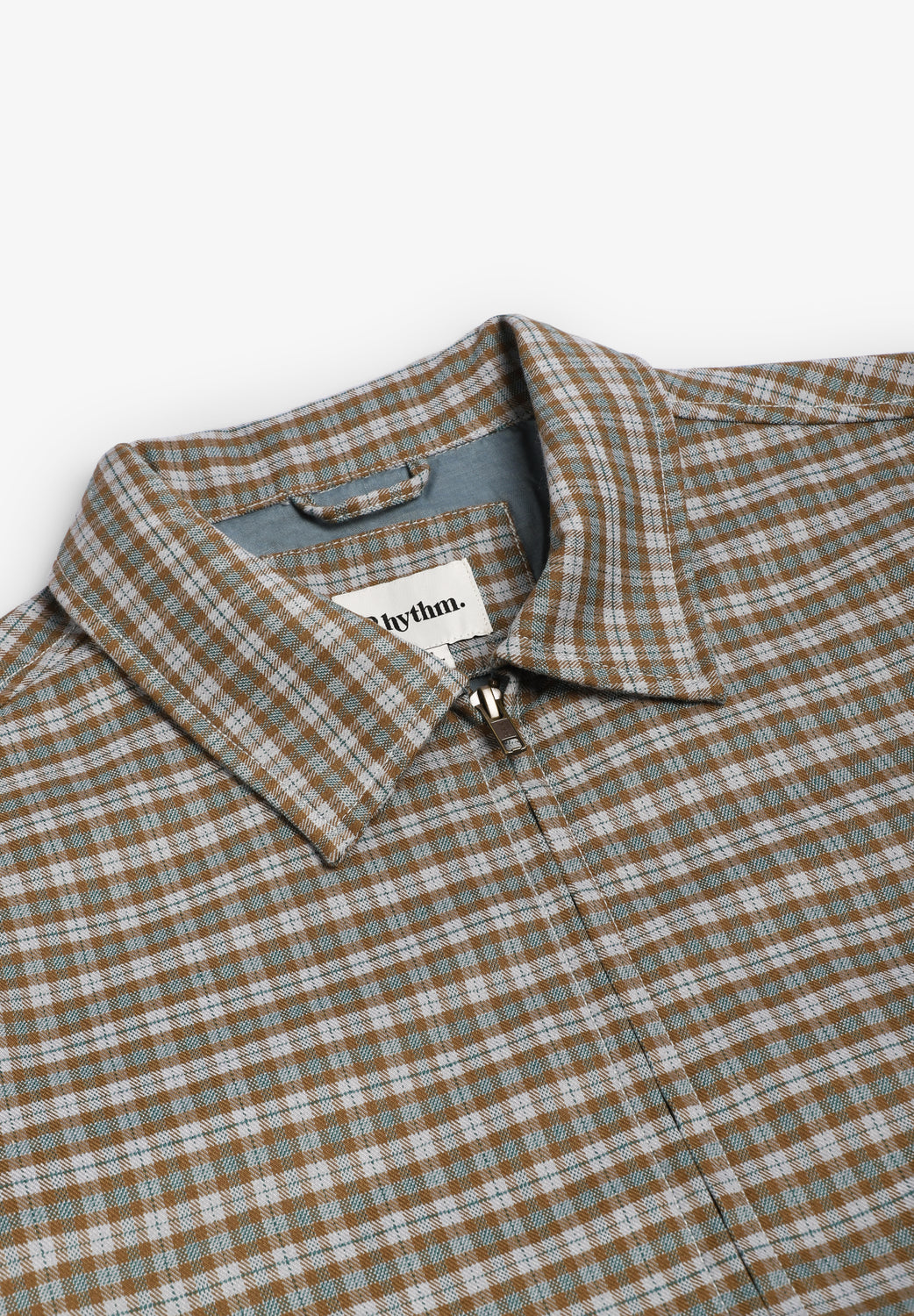 Chaqueta Rhythm confeccionada en 100% algodón y corte oversize. Cuenta con un diseño de estampado de cuadros, cierre de cremallera metálica, bolsillos laterales inclinados y los característicos ribetes Rhythm.