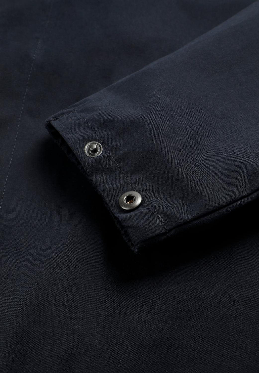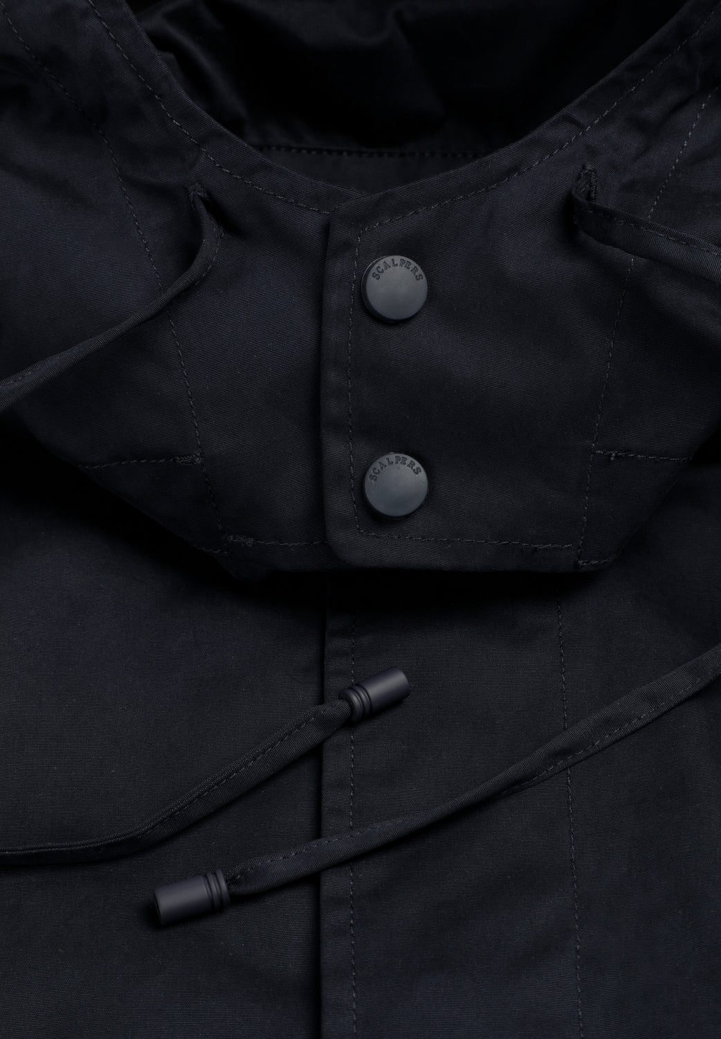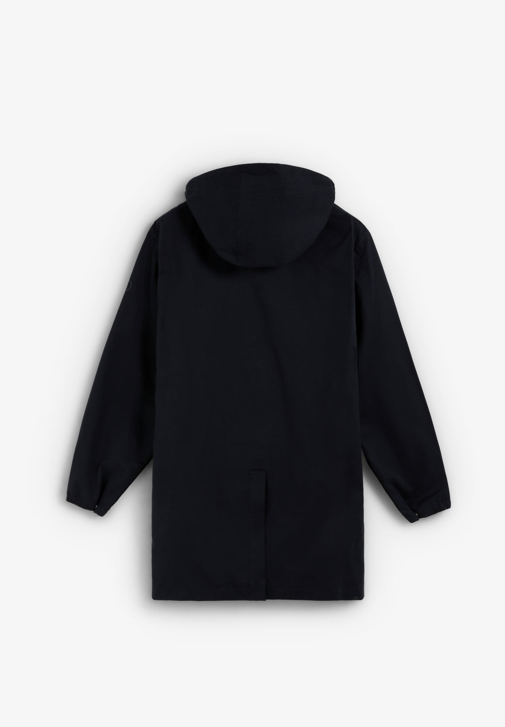 Parka confeccionada en mezcla de algodón. Capucha desmontable por botones a presión. Abertura en espalda con cierre por botón. Cuello alto. Cierre frontal mediante cremallera y botones. Puños ajustables. Calavera a tono en manga izquierda.