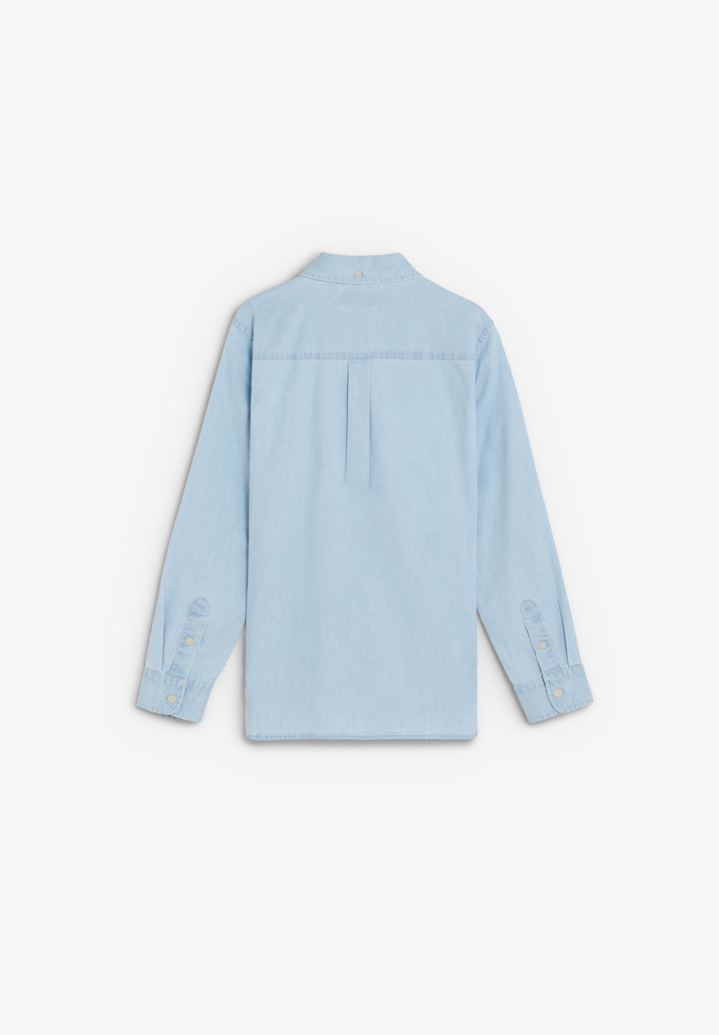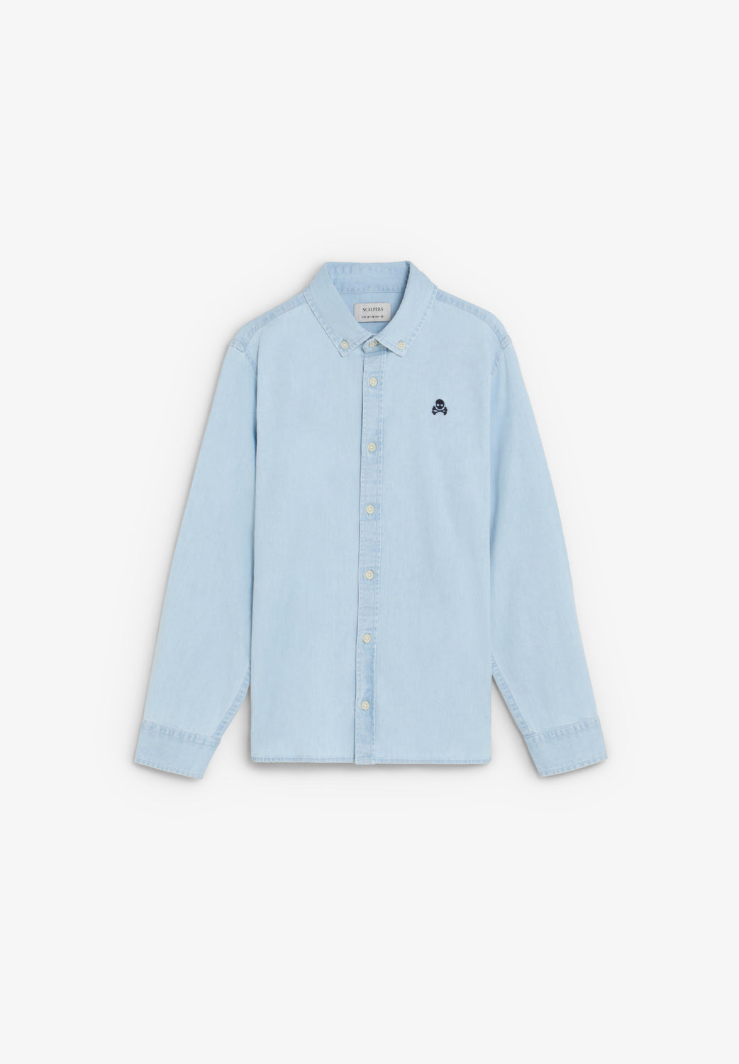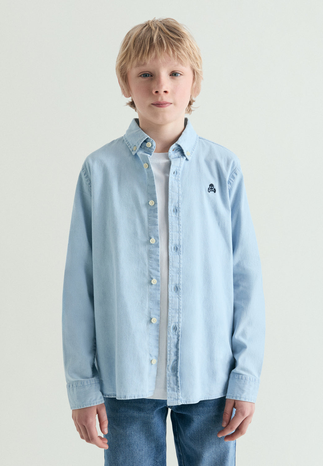 Camisa denim confeccionada en mezcla de algodón. Regular Fit. Cuello con botones. Manga larga con botones en el puño. Detalle calavera bordada en el pecho. Cierre con botones.