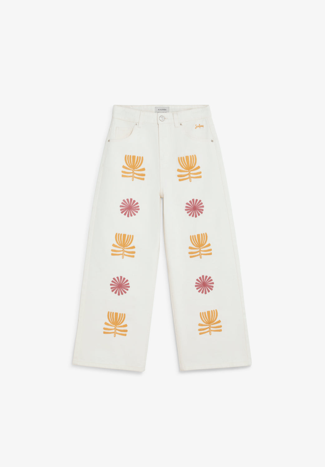 Pantalón denim culotte confeccionado en 100% algodón BCI. Detalles bordados en la parte delantera. Trabillas en la cintura y cierre con cremallera y botón.