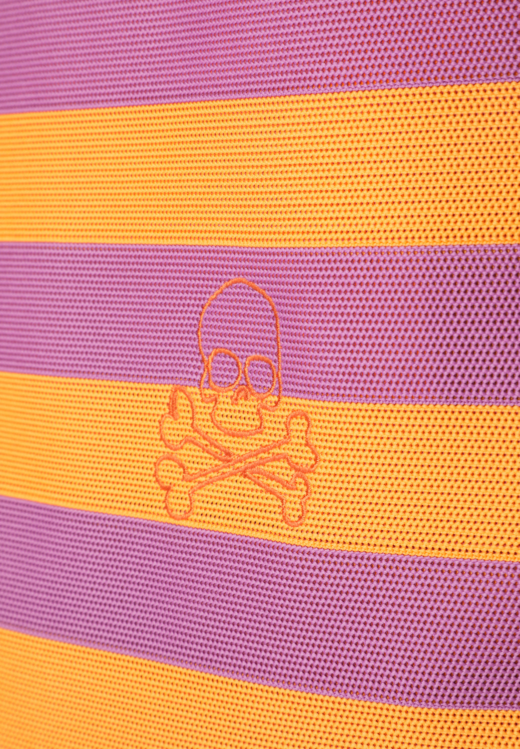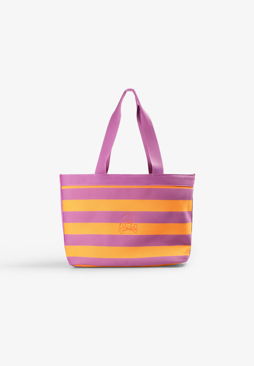 Bolso tote de rayas a contraste con doble asa. Detalle calavera bordada. Cierre con tiras y botón.