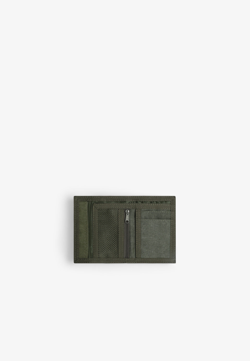 Cartera plegable con compartimentos interiores para tarjetas y bolsillo con cierre de cremallera. Diseño compacto en tejido resistente.