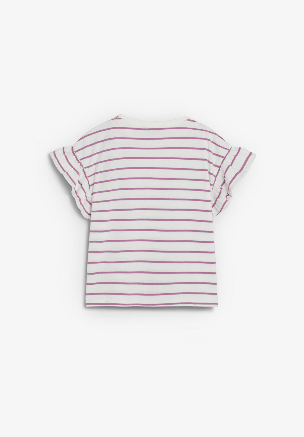 Camiseta bordada en 100% algodón BCI. Cuello redondo a contraste. Manga corta con volante. Estampado de rayas y calavera bordada en el pecho a contraste.