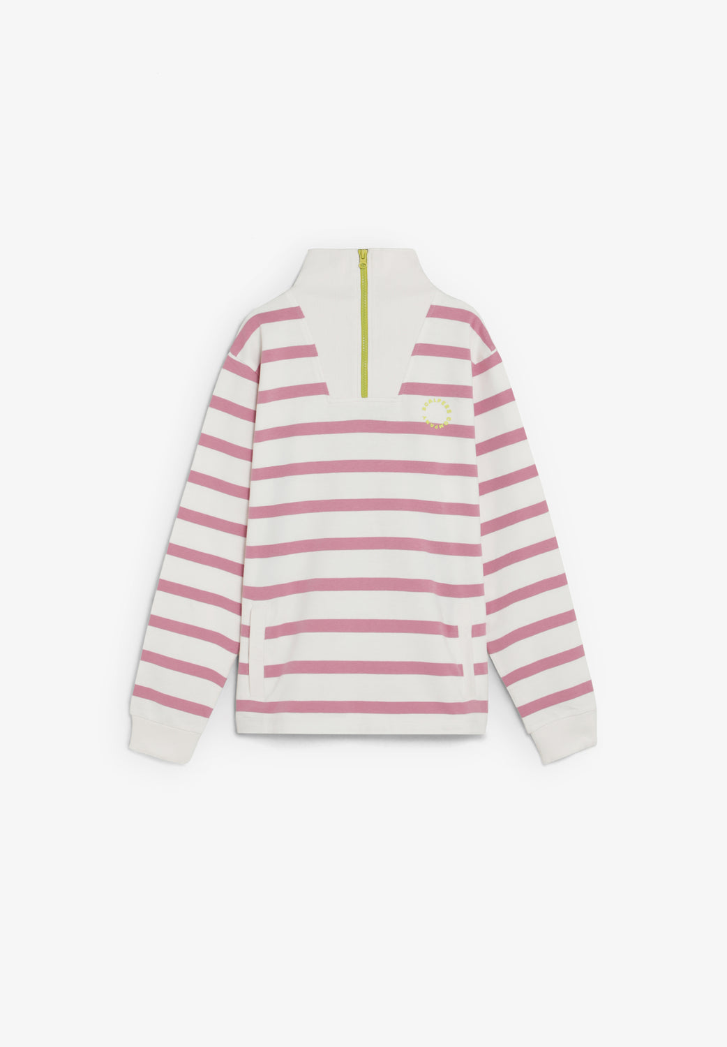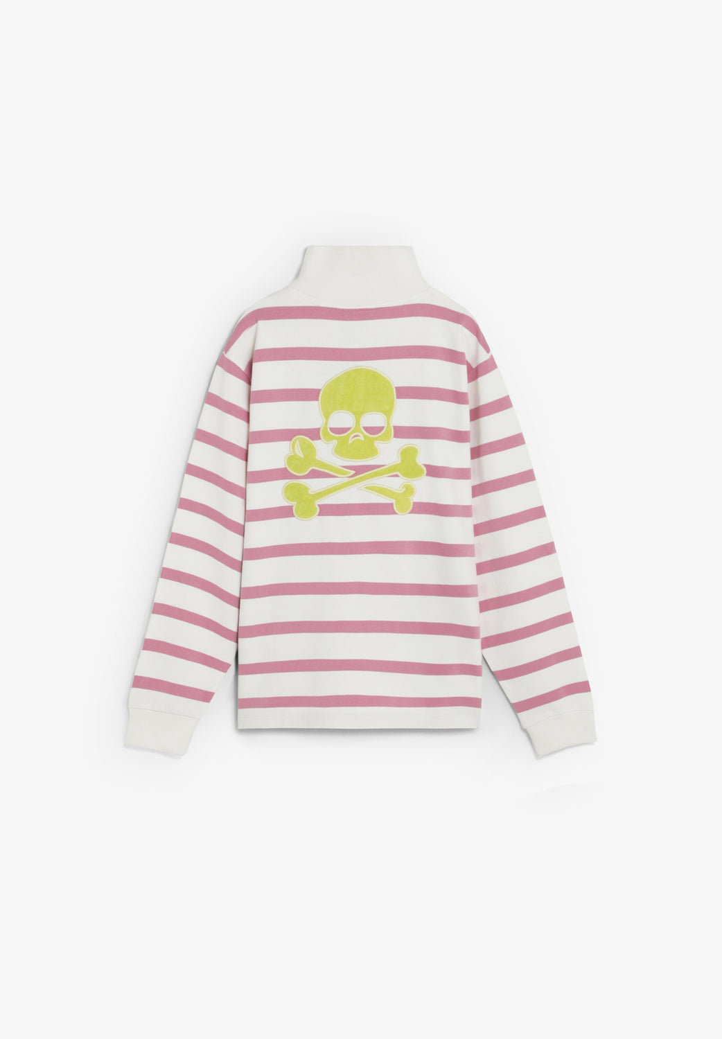Sudadera confeccionada en 100% algodón BCI. Manga larga. Cuello alto con cremallera a contraste. Bolsillos tipo canguro en frontal. Estampado a rayas. Calavera bordada en espalda. Detalle de logo en pecho. Acabados acanalados.
