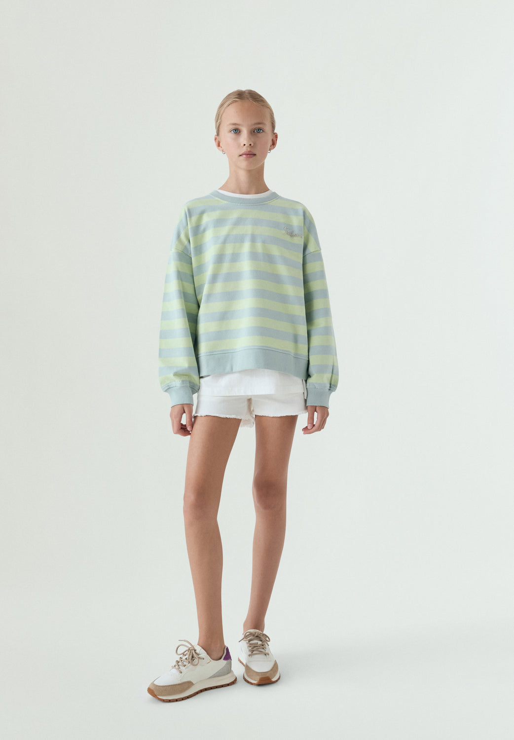 Sudadera confeccionada en 100% algodón . Relaxed Fit. Cuello redondo y manga larga. Estampado de rayas. Detalle logo bordado en hilo metalizado en el pecho. Acabados en rib.