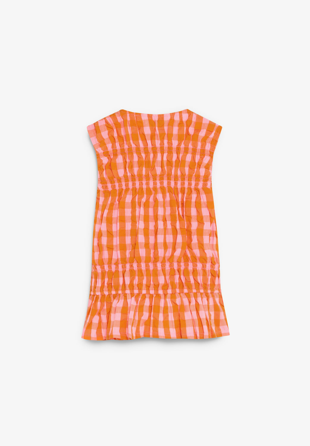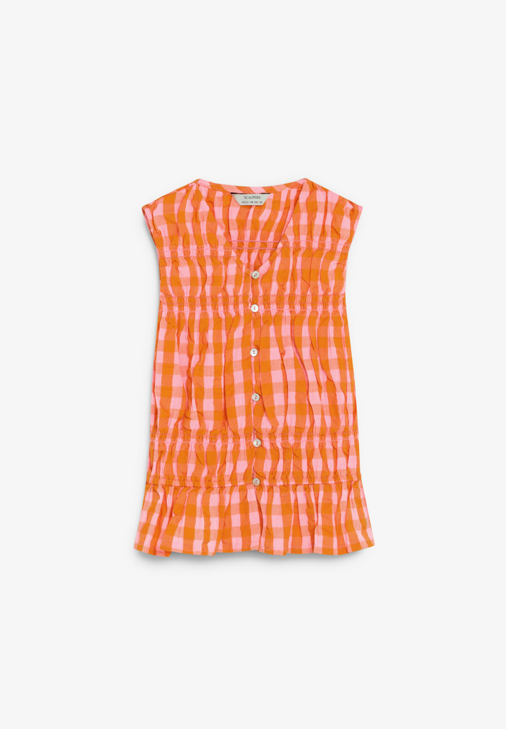 Top confeccionado en 100% algodón. Estampado vichy. Regular Fit. Cuello de pico y manga sisa. Cierre mediante botones frontales. Detalle frunces.