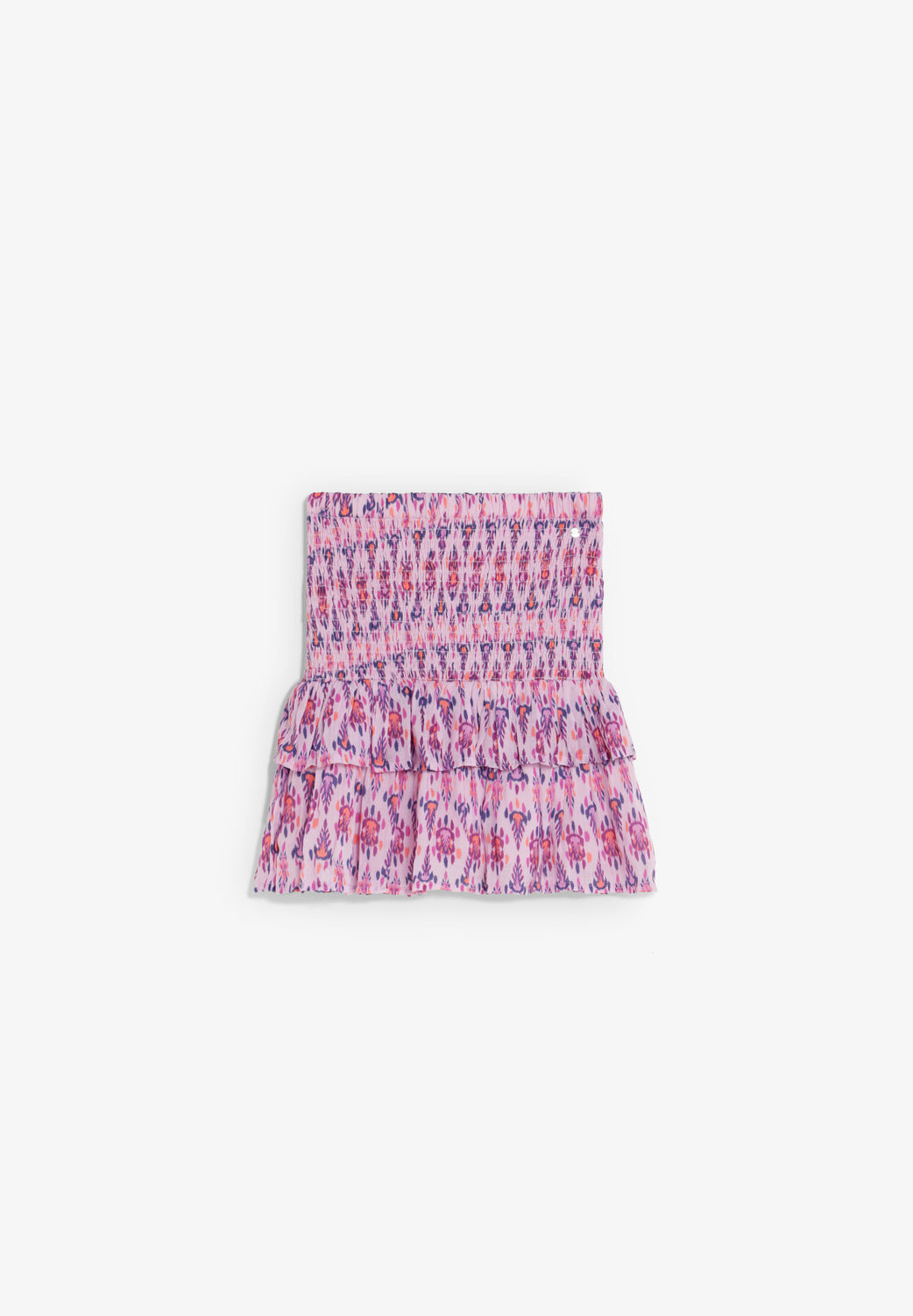 Falda corta confeccionada en tejido ligero. Detalle de nido de abeja en la parte superior y volante en el bajo. Estampado multicolor.