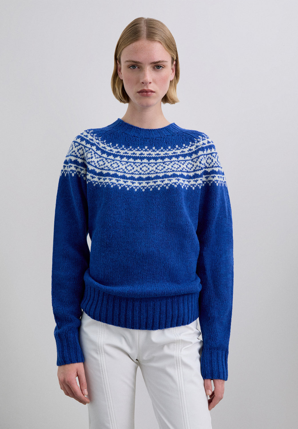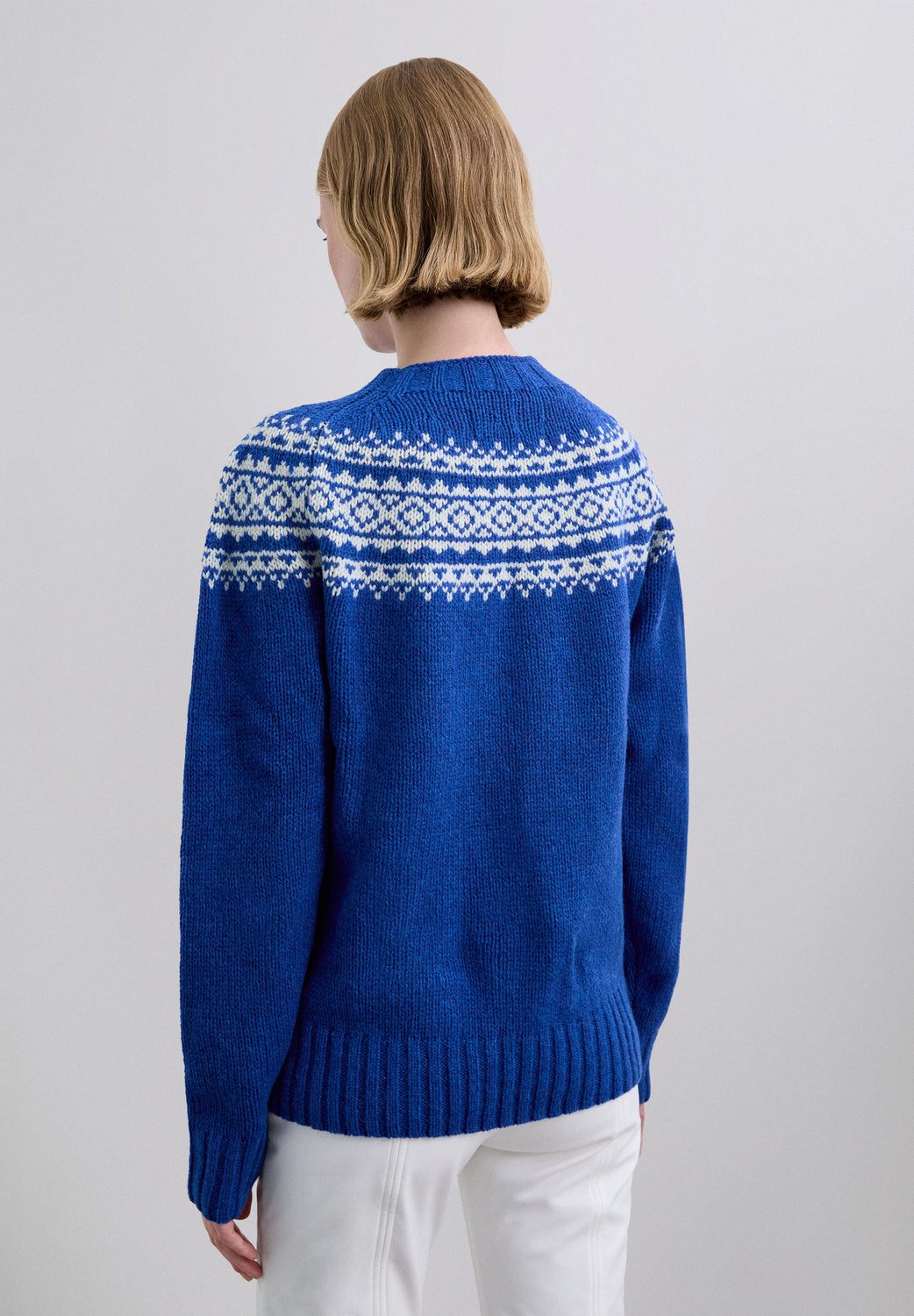 Jersey confeccionado en 100% lana con estampado invernal en el pecho.. Presenta cuello redondo, manga larga y corte regular. Mangas y bajo en rib.