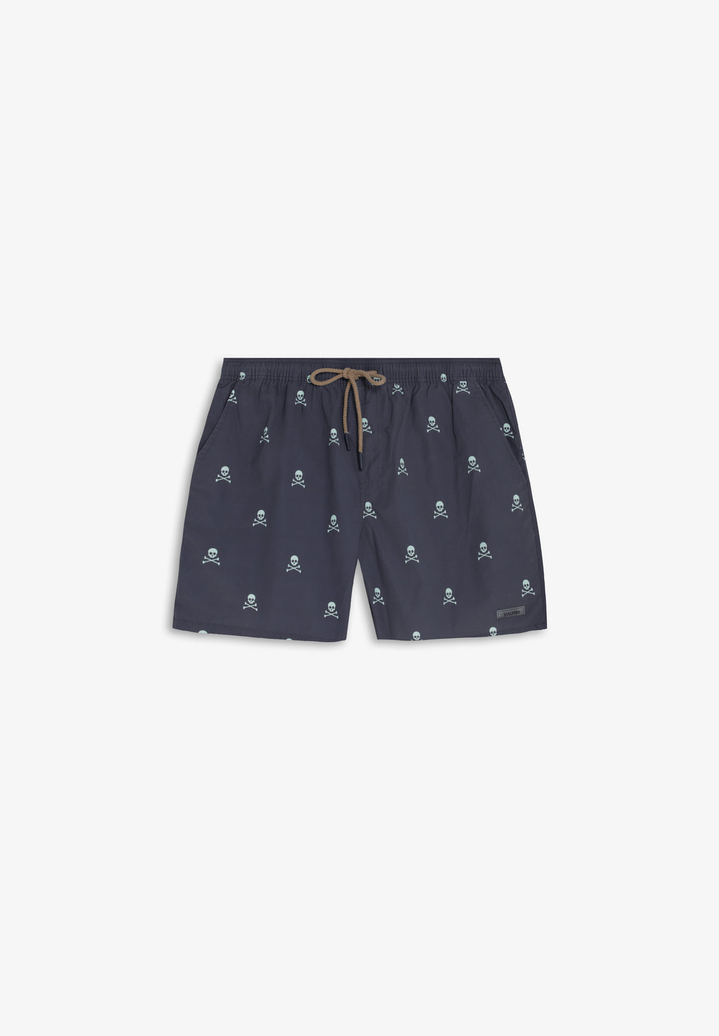 Bañador con cinturilla elástica y cordón ajustable. Bolsillos laterales. Estampado de calaveras a contraste. Bolsillo trasero.