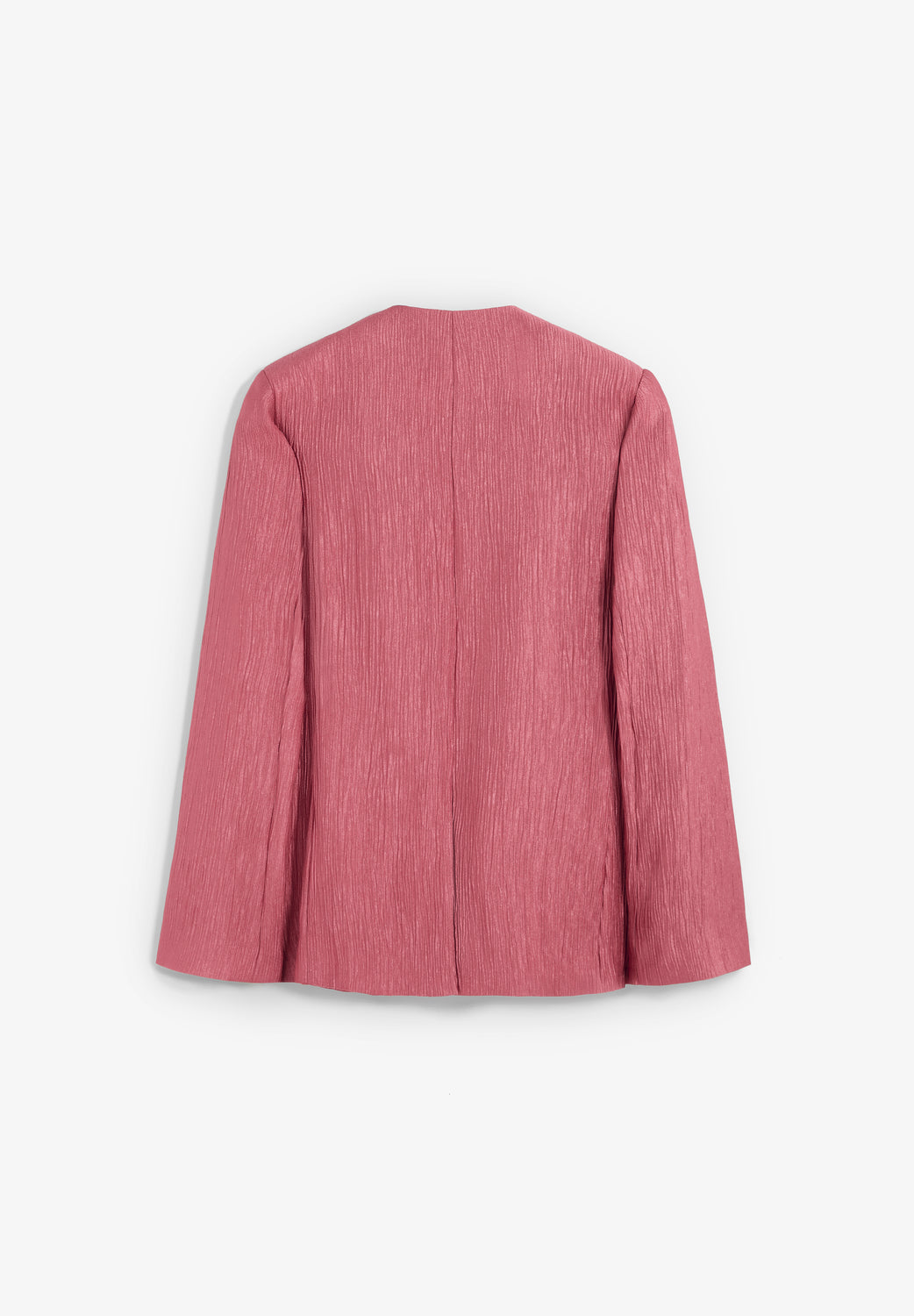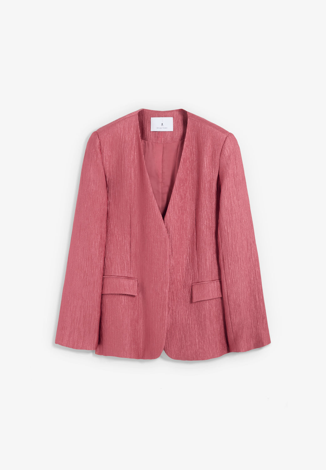 Blazer de sastrería clásica confeccionada en tejido satinado con textura. Corte recto, regular fit. Cuello en pico sin solapa. Manga larga y recta. Bolsillos delanteros de vivo con tapa. Espalda recta con abertura vertical en el bajo.