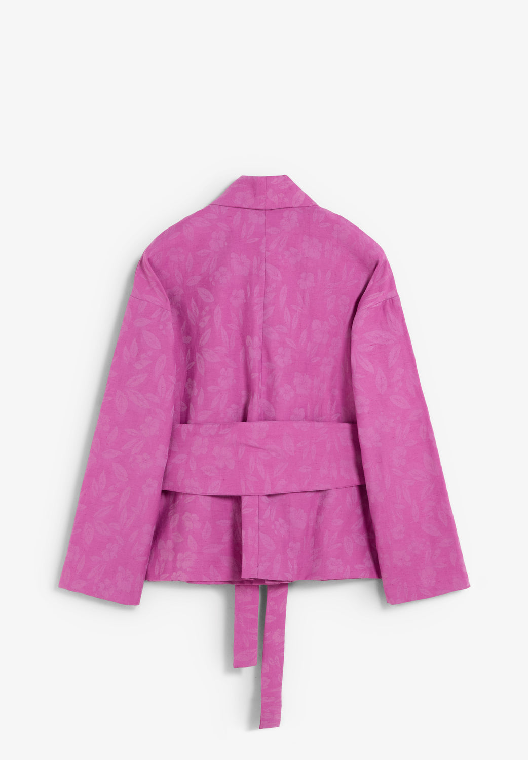 Blazer confeccionada en tejido jacquard con estructura tipo kimono. Cuello amplio con solapa ajustado a la cintura con fajín ajustable del mismo tejido. Mangas largas y rectas. Cierre con corchete interior.