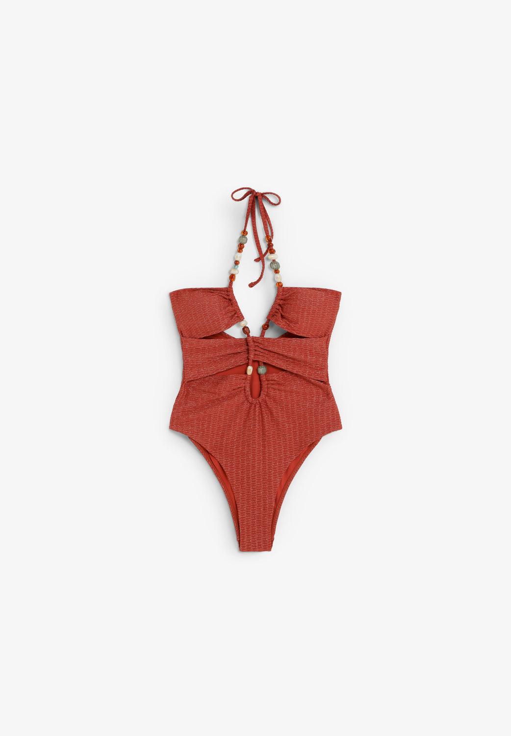 Bañador confeccionado en tejido elástico con hilo metalizado e interior forrado. Detalle aberturas. Lazada ajustable al cuello con abalorios. Espalda descubierta.