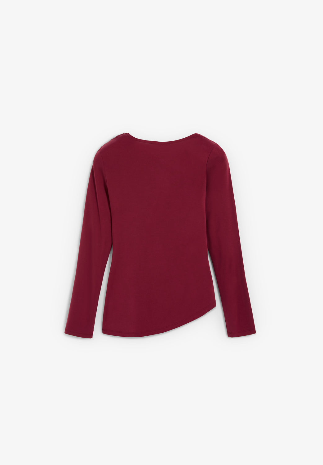 Camiseta confeccionada en cupro con caída fluida. Corte slim fit, escote asimétrico, detalles de frunce en hombro y cintura. Manga larga.