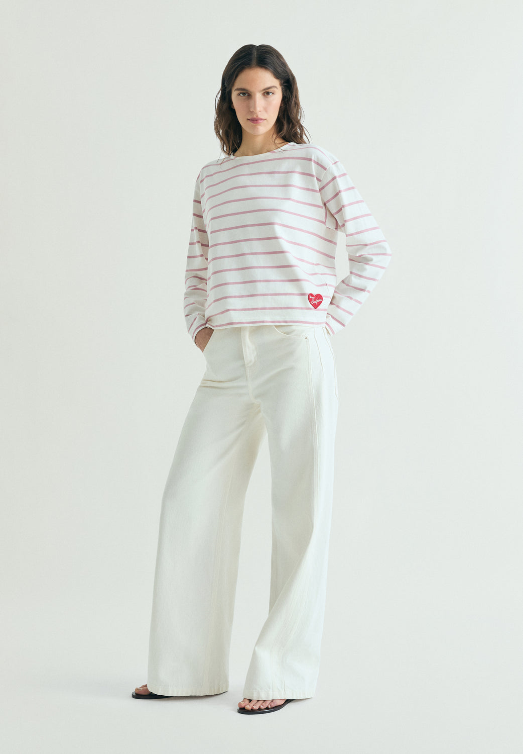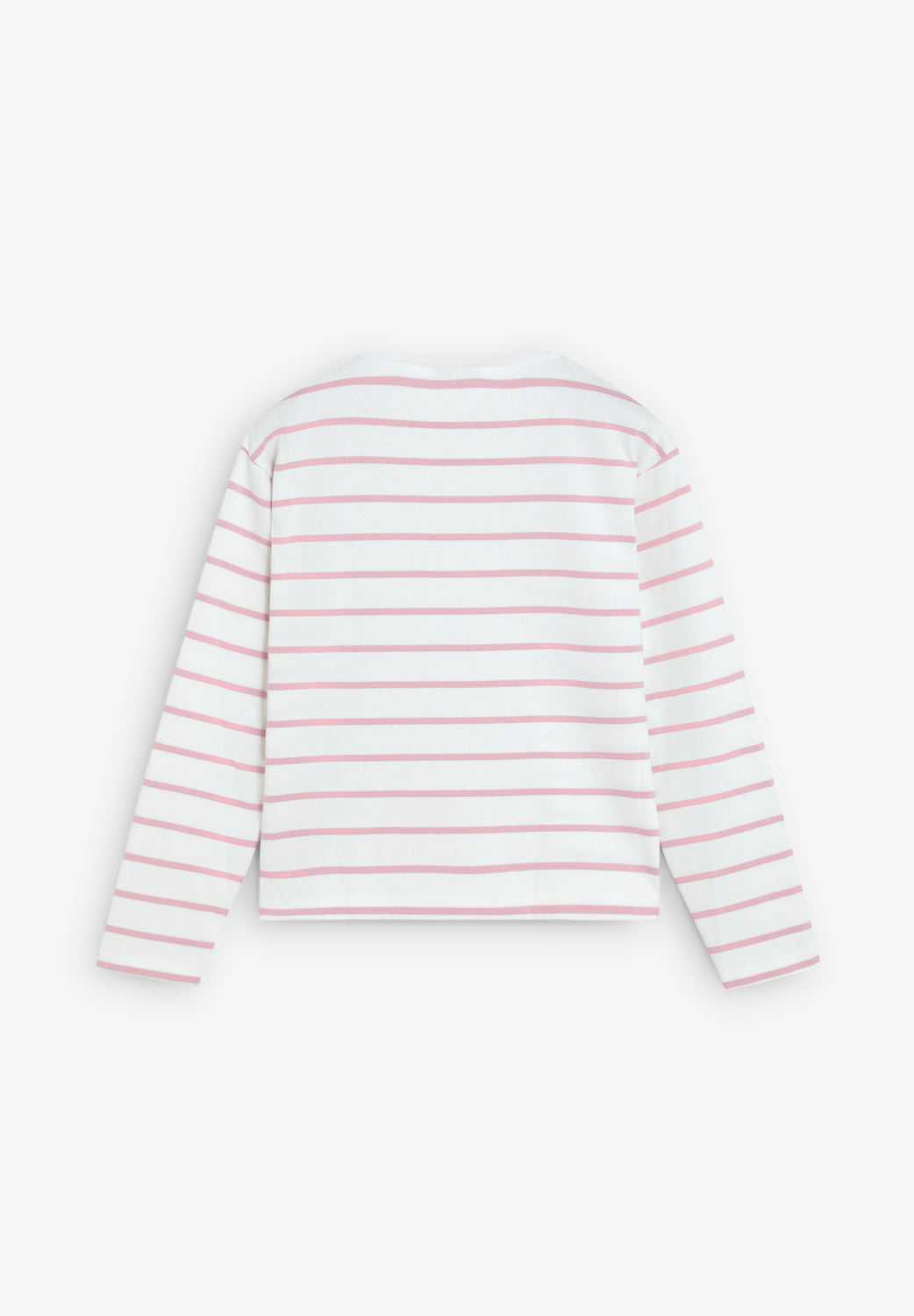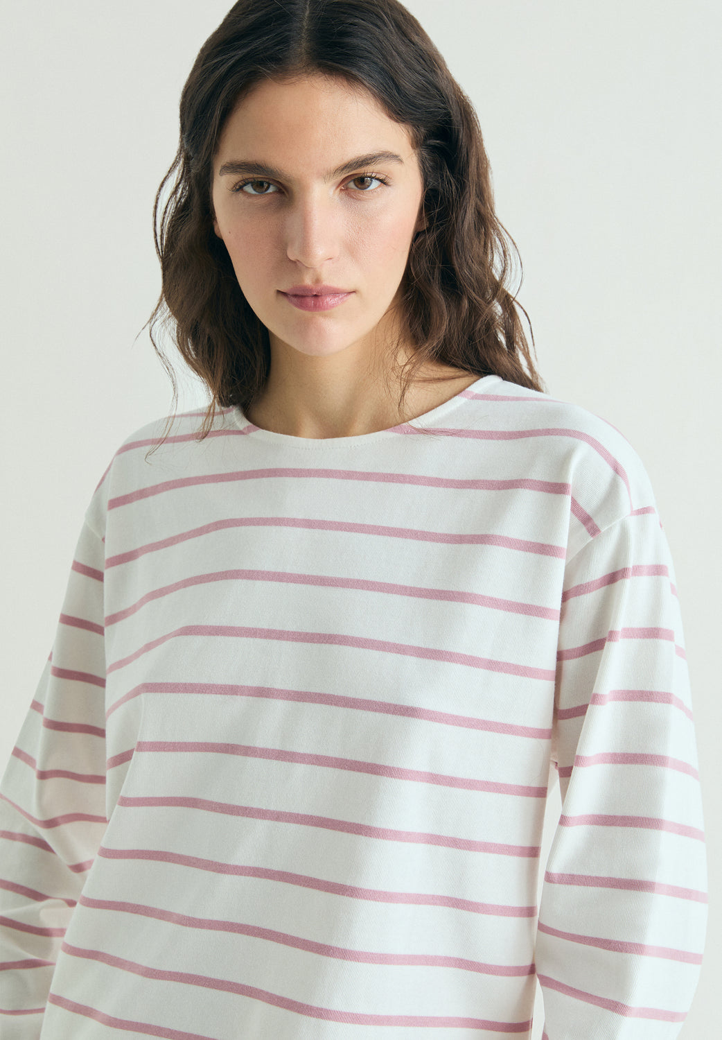 Camiseta de rayas confeccionada en 100% algodón . Corte regular fit, cuello redondo y manga larga. Detalle de parche con logo en frontal bajo.