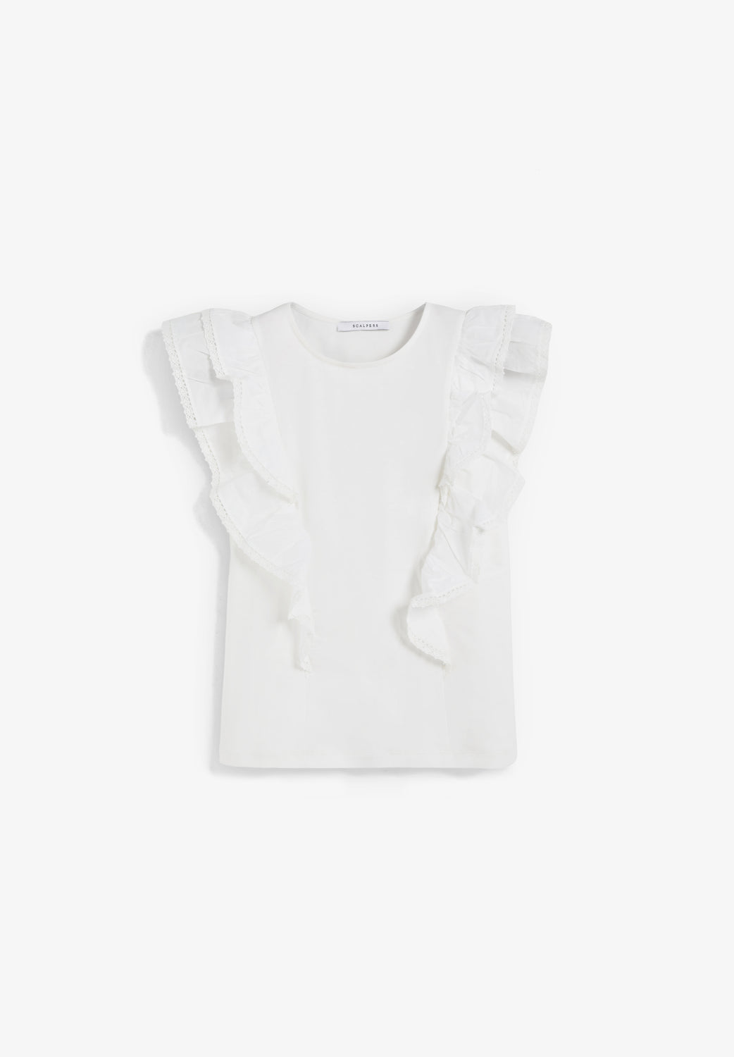 Camiseta confeccionada en 100% algodón. Relaxed fit. Cuello redondo y manga a la sisa. Volantes con puntilla decorativa.