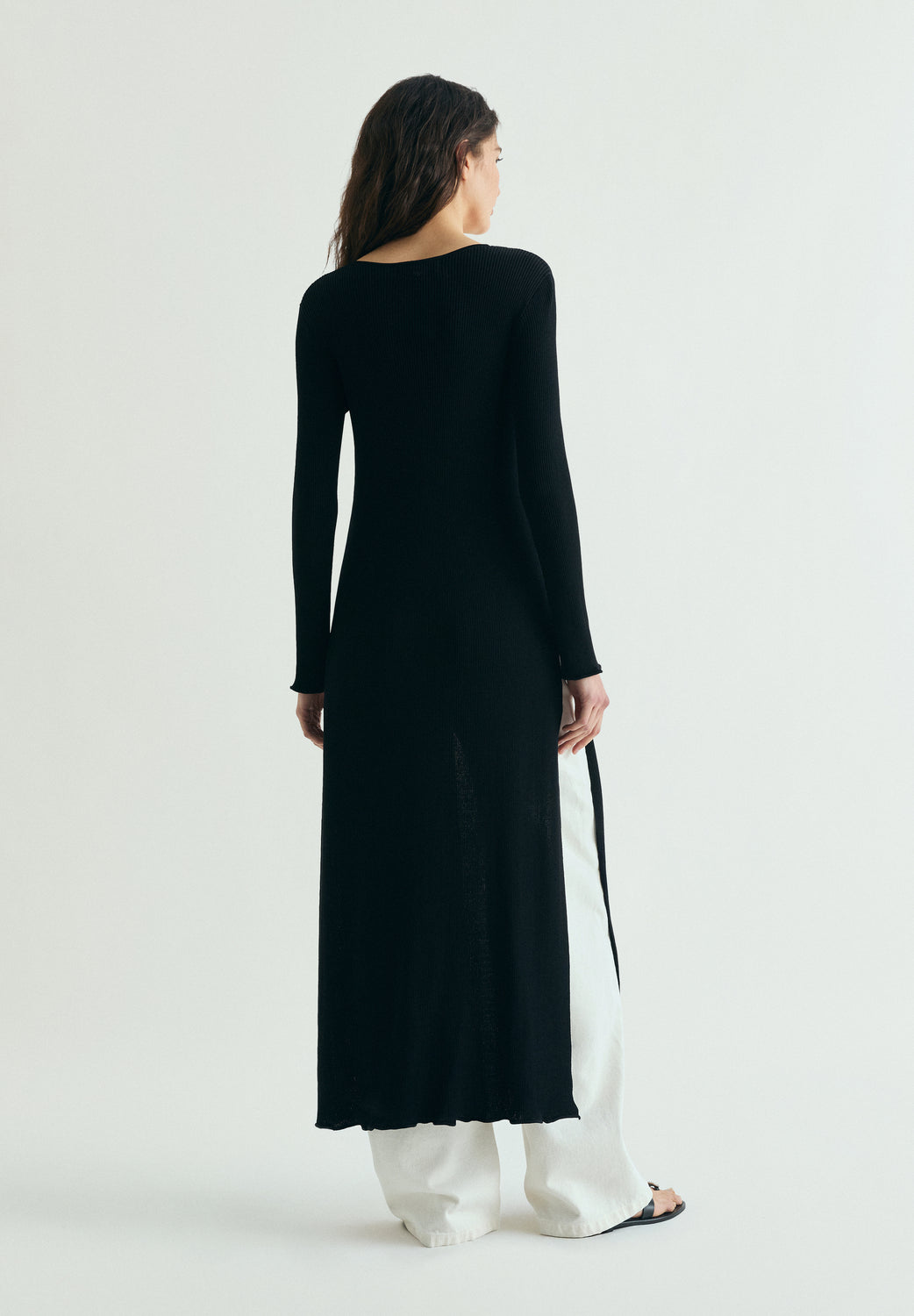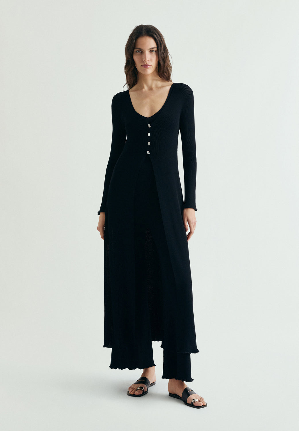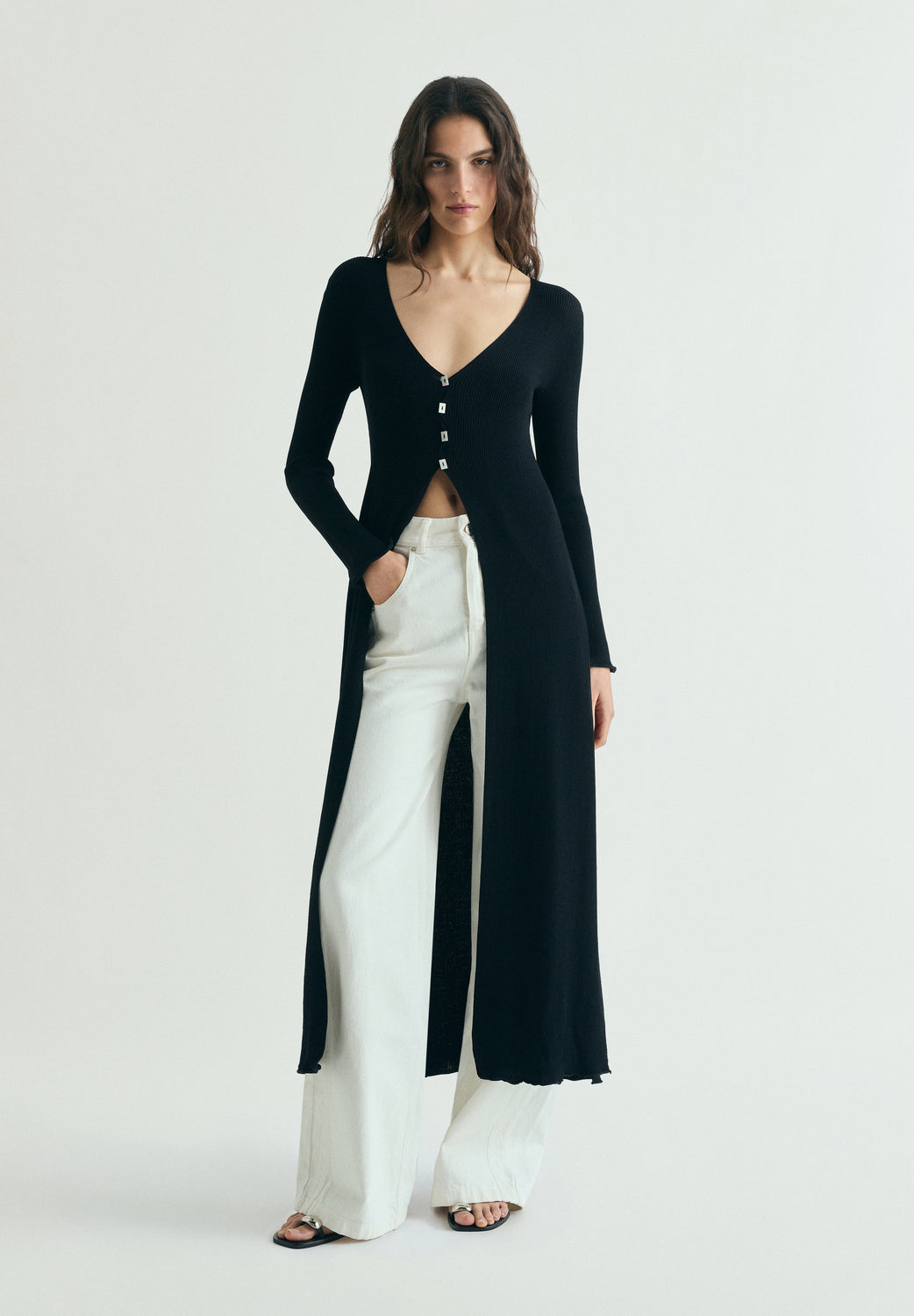 Cardigan largo confeccionado en tejido de punto acanalado. Escote en pico. Mangas largas. Cierre frontal.