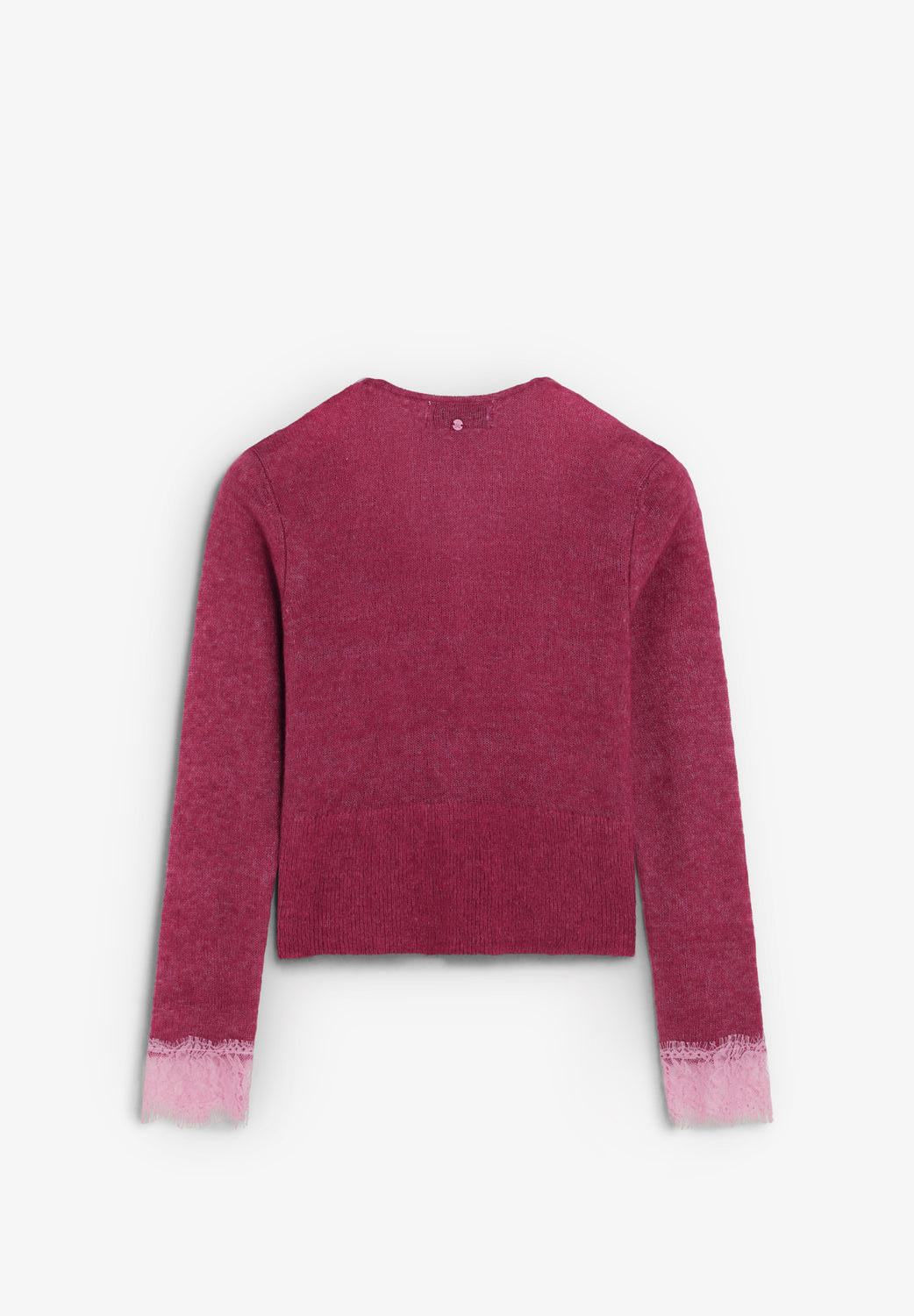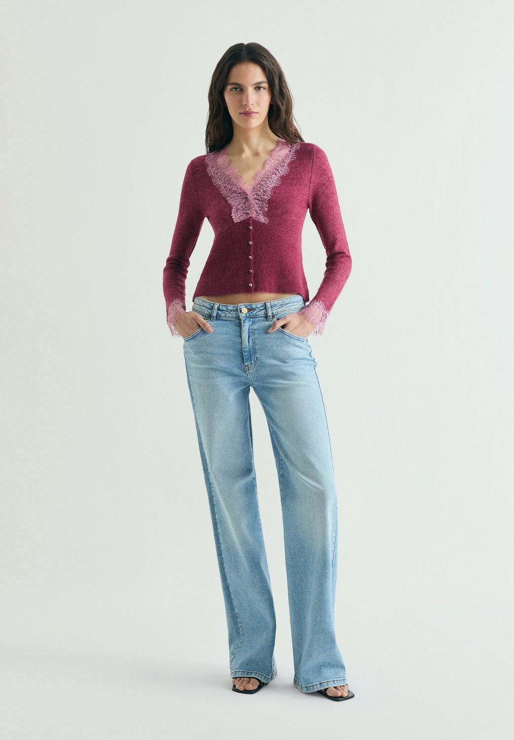 Cárdigan confeccionado en mezcla de lana. Cuello en pico y manga larga. Detalle encaje en cuello y mangas. Tejido acanalado en la parte inferior. Cierre mediante botones frontales.