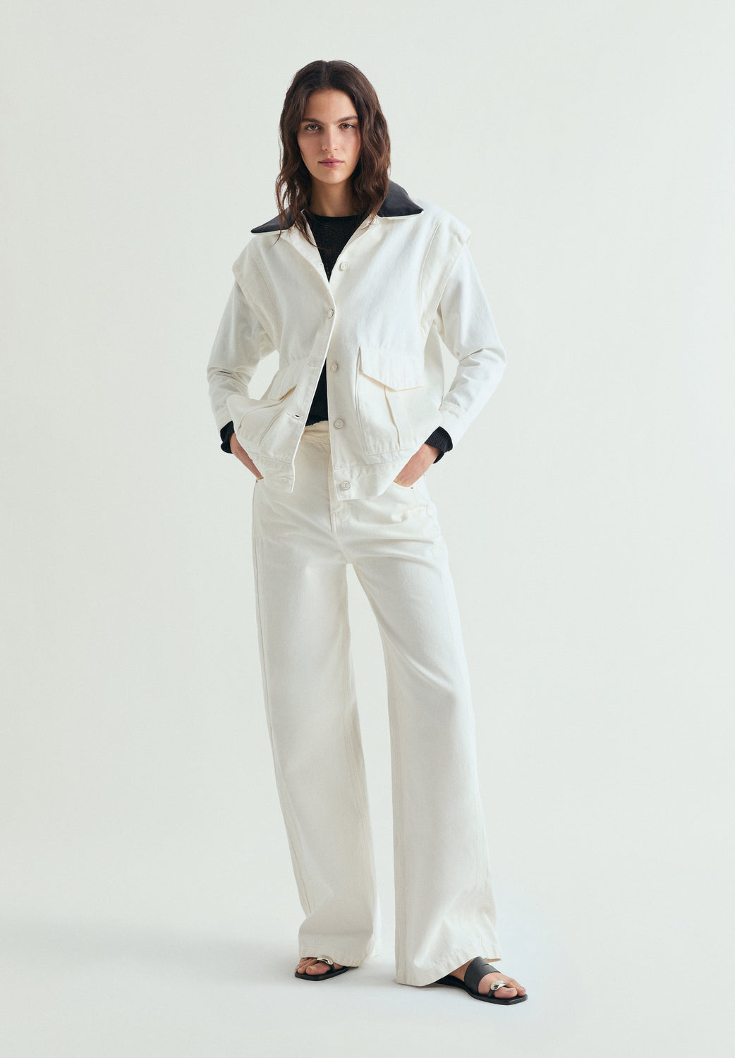 Chaqueta denim confeccionada en 100% algodón. Corte regular fit, cuello con solapa a contraste en piel sintética. Corte regular fit, pliegue en sisa efecto hombrera. Cierre con botones. Bolsillos delanteros con tapeta.