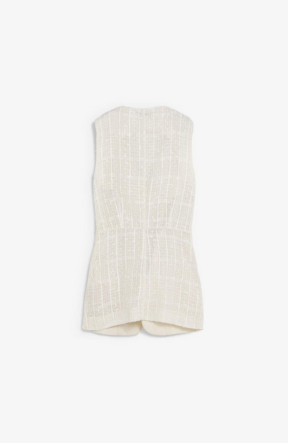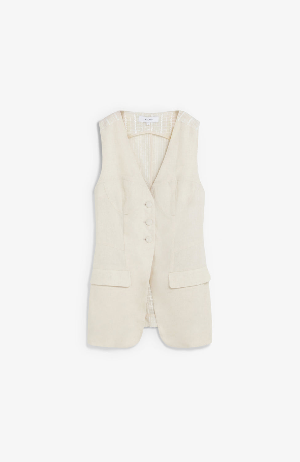 Chaleco confeccionado en mezcla de lino. Slim fit. Escote en pico y manga a la sisa. Pecho con estructura estilo corsé. Bolsillos frontales con tapeta. Cierre delantero con botonadura forrada.