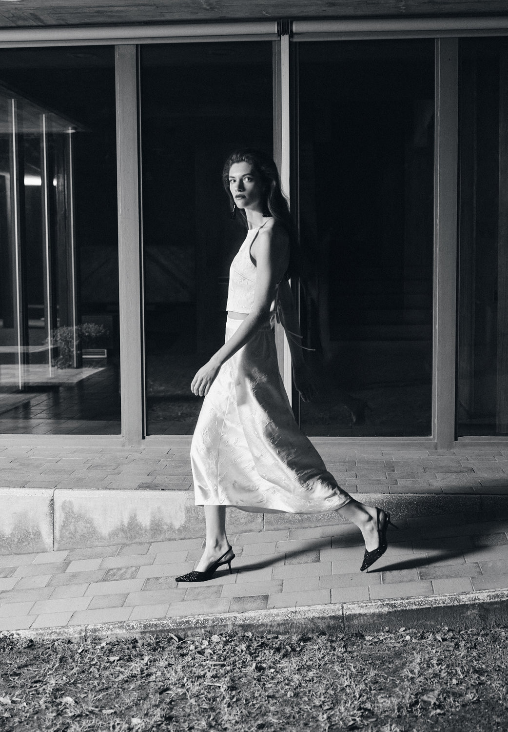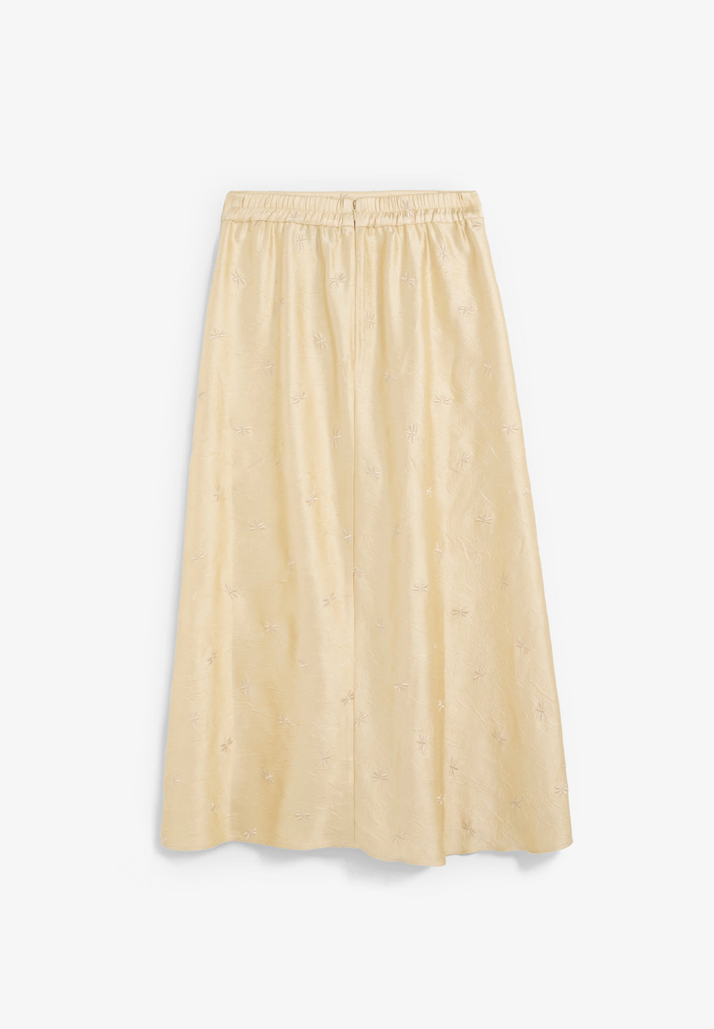 Falda midi confeccionada en tejido satinado con bordados florales a tono. Regular fit, corte amplio hacia el bajo. Cintura de talle medio/alto. Cierre con cremallera invisible en el lateral.
