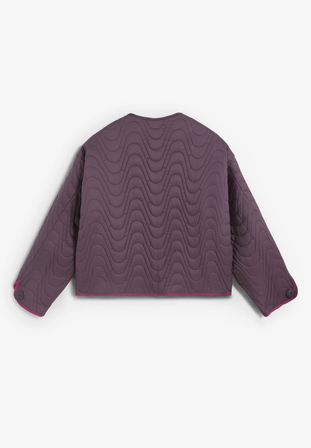 Chaqueta acolchada reversible con estampado print, de corte recto. Cuello redondo que une en el delantero con una solapa unida. Cierre mediante botones. Manga recta de corte ranglan y ligera curva en el puño a modo decorativo. Bolsillo de parche sin tapeta. Ribete decorativo en los hombros, mangas y bolsillos. Espalda recta.