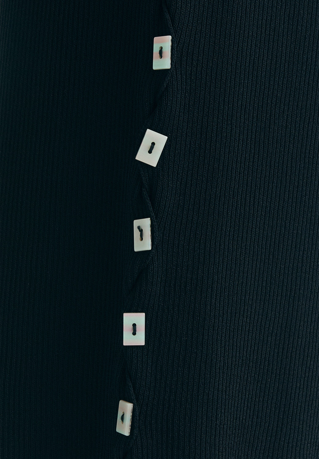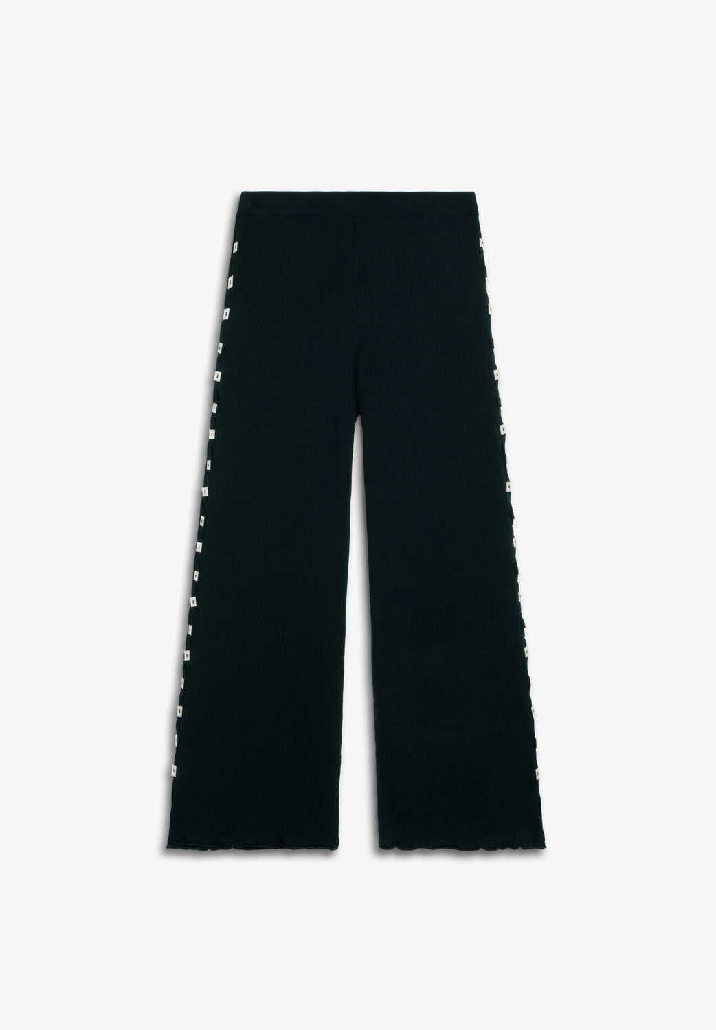 Pantalón confeccionado en tejido de punto acanalado. Caída fluida. Tiro medio. Calce recto con pierna amplia. Incorpora apliques laterales decorativos integrados en la costura. Terminación inferior recta con leve ondulación natural del tejido.