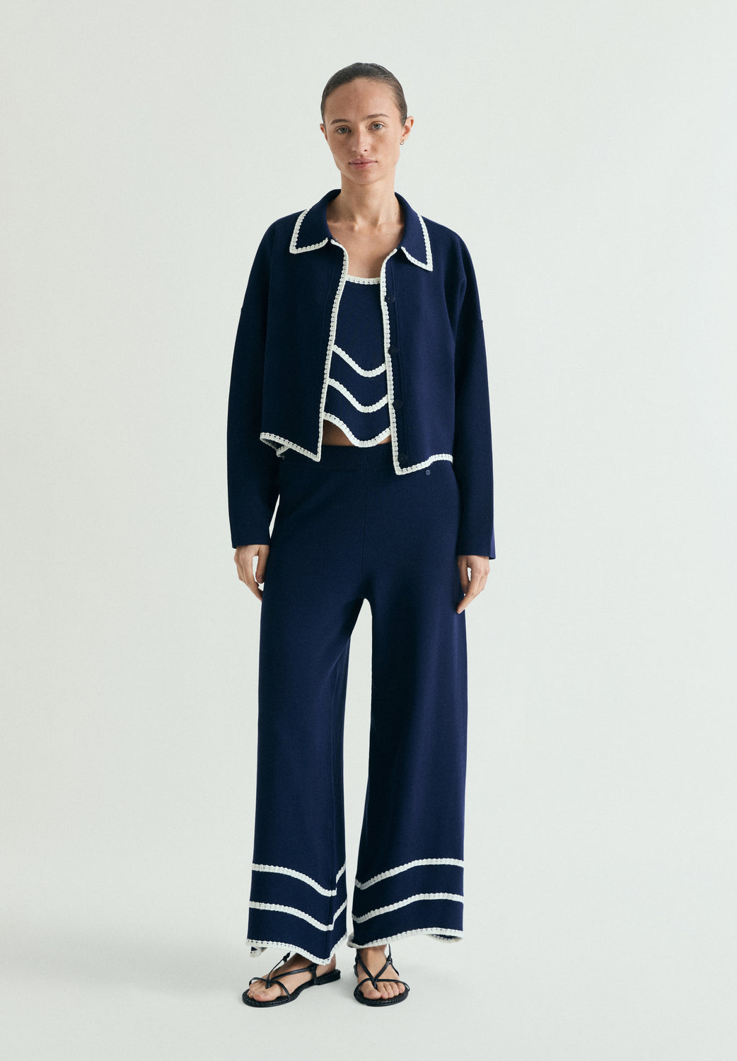 Pantalón confeccionado en punto fino. Tiro alto, relaxed fit. Cinturilla elástica. Detalles a contraste en el bajo. Bolsillos de parche traseros.