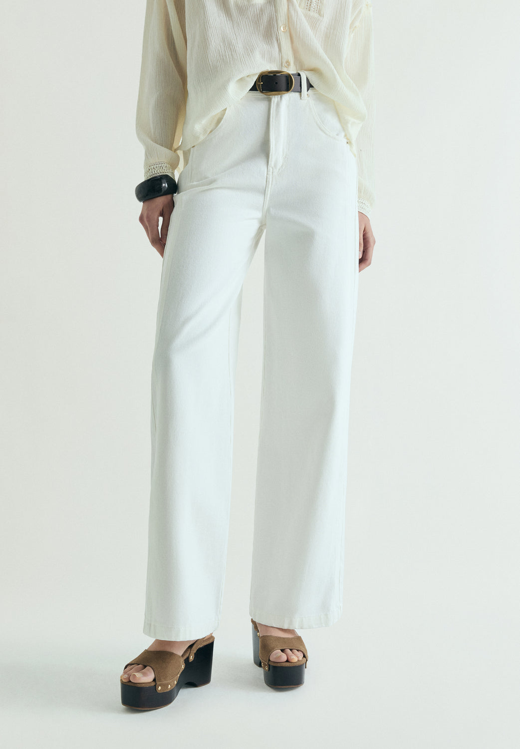 Pantalón denim confeccionado en 100% algodón BCI. Corte regular fit, recto. High-Waist, con cierre de cremallera y botón. Trabillas en cintura. Bolsillos delanteros y traseros.