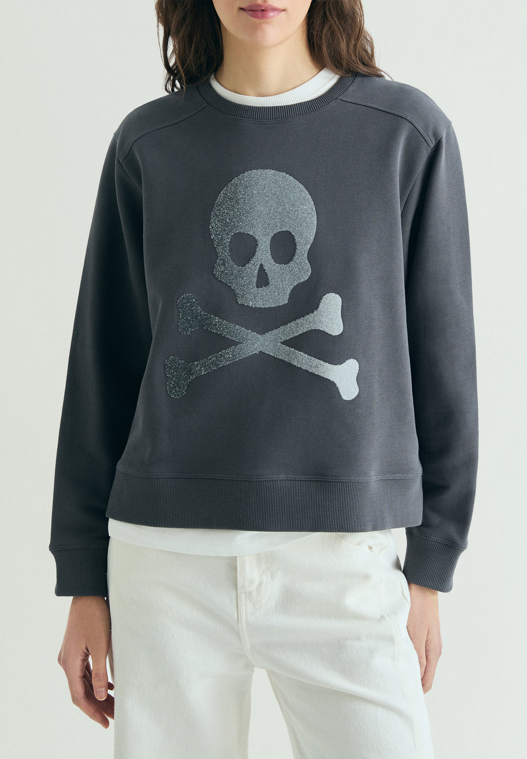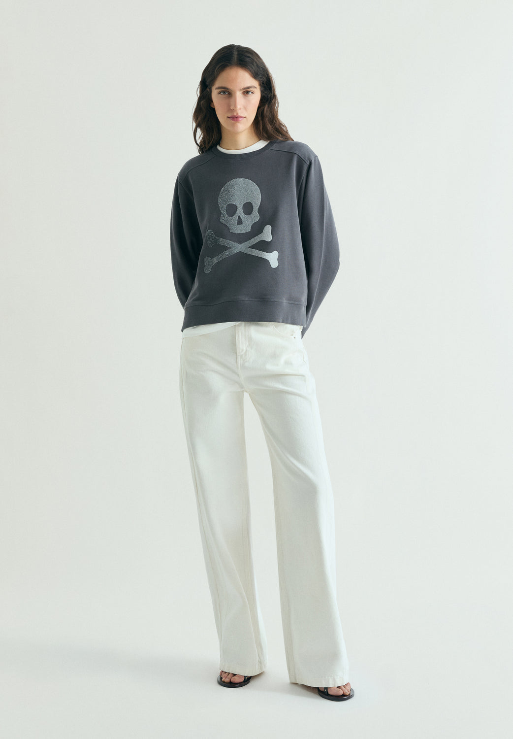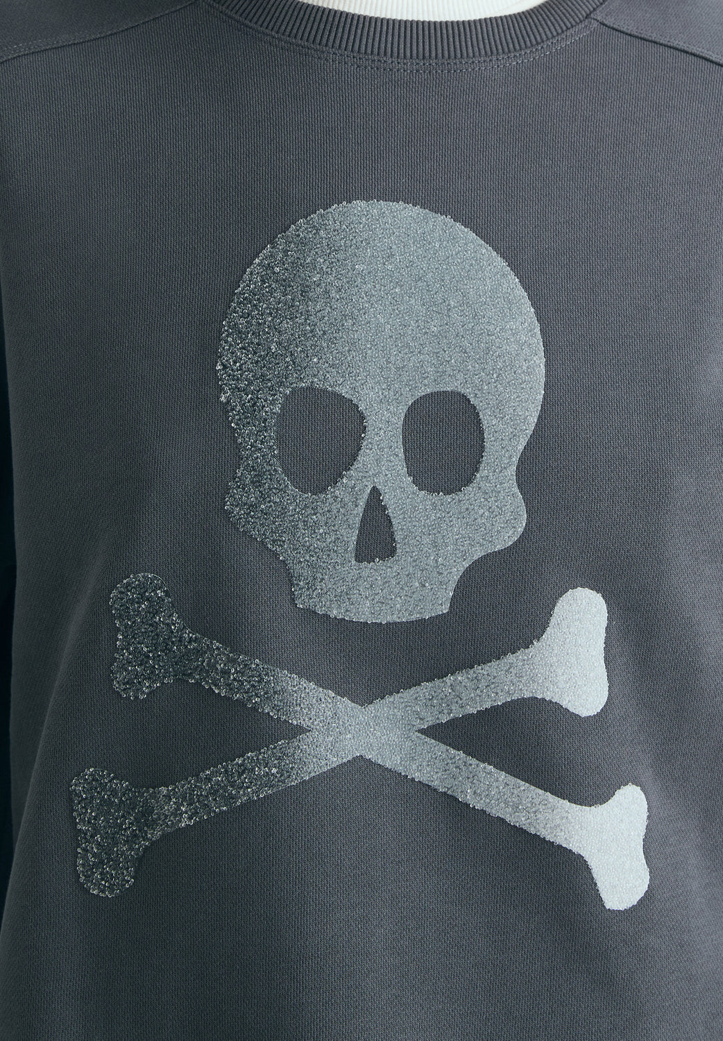 Sudadera confeccionada en 100% Algodón BCI. Corte Regular fit. Cuello redondo. Manga larga. Acabados en rib. Detalle de calavera glitter en la parte delantera.