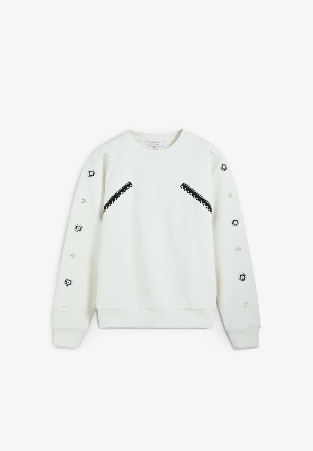 Sudadera confeccionada en 100% algodón BCI. Bordados decorativos y detalles aplicados en mangas. Cuello redondo, mangas largas y terminaciones con rib en cuello, puños y cintura.