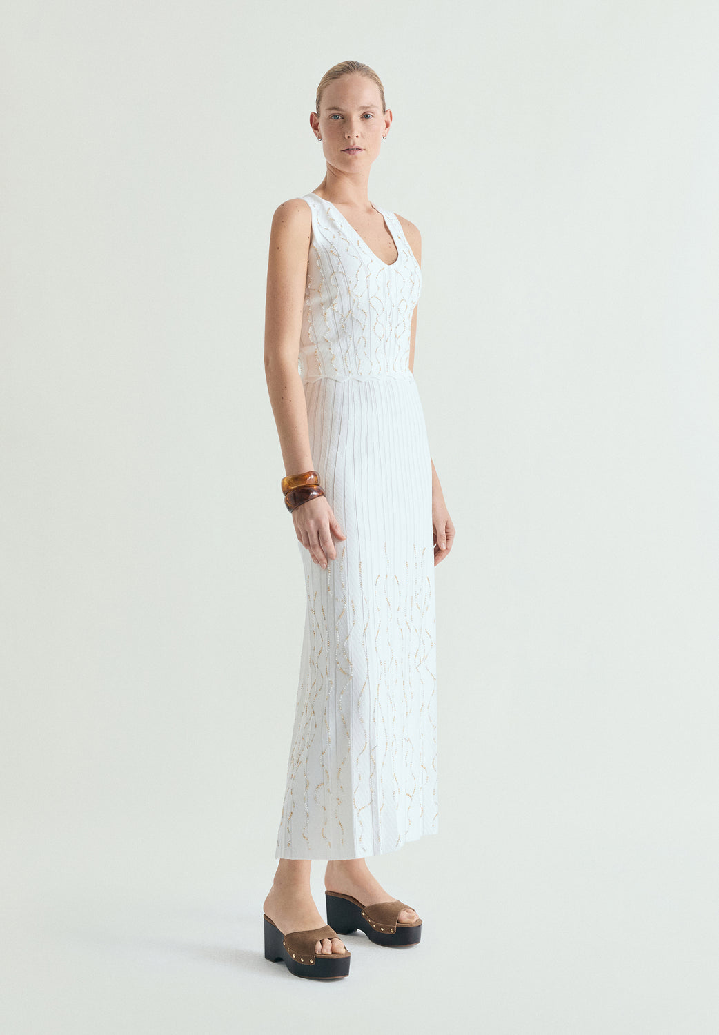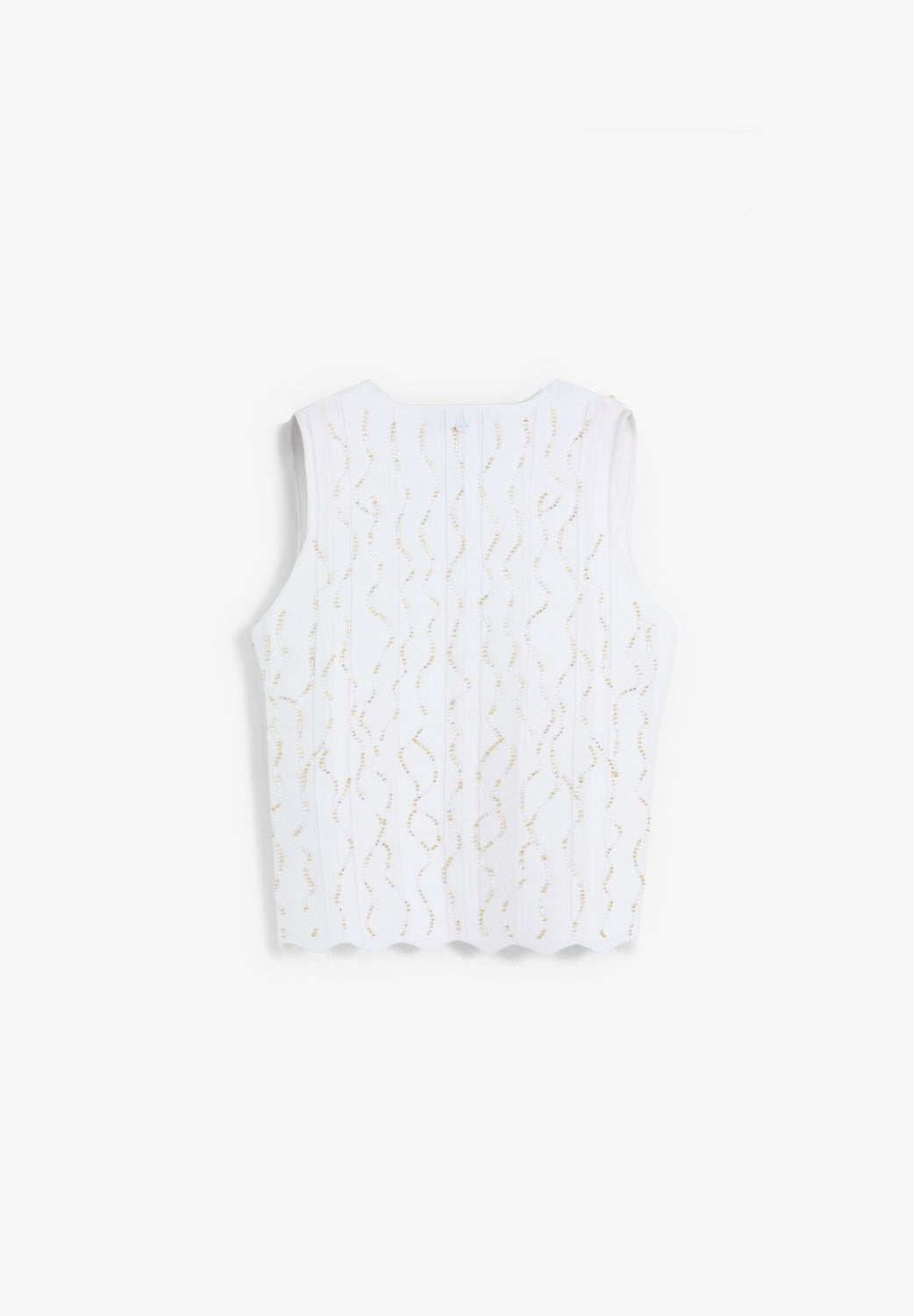 Top confeccionado en punto. Cuello en pico y tirantes anchos. Detalle abalorios en contraste. Acabado con ondas en el bajo.