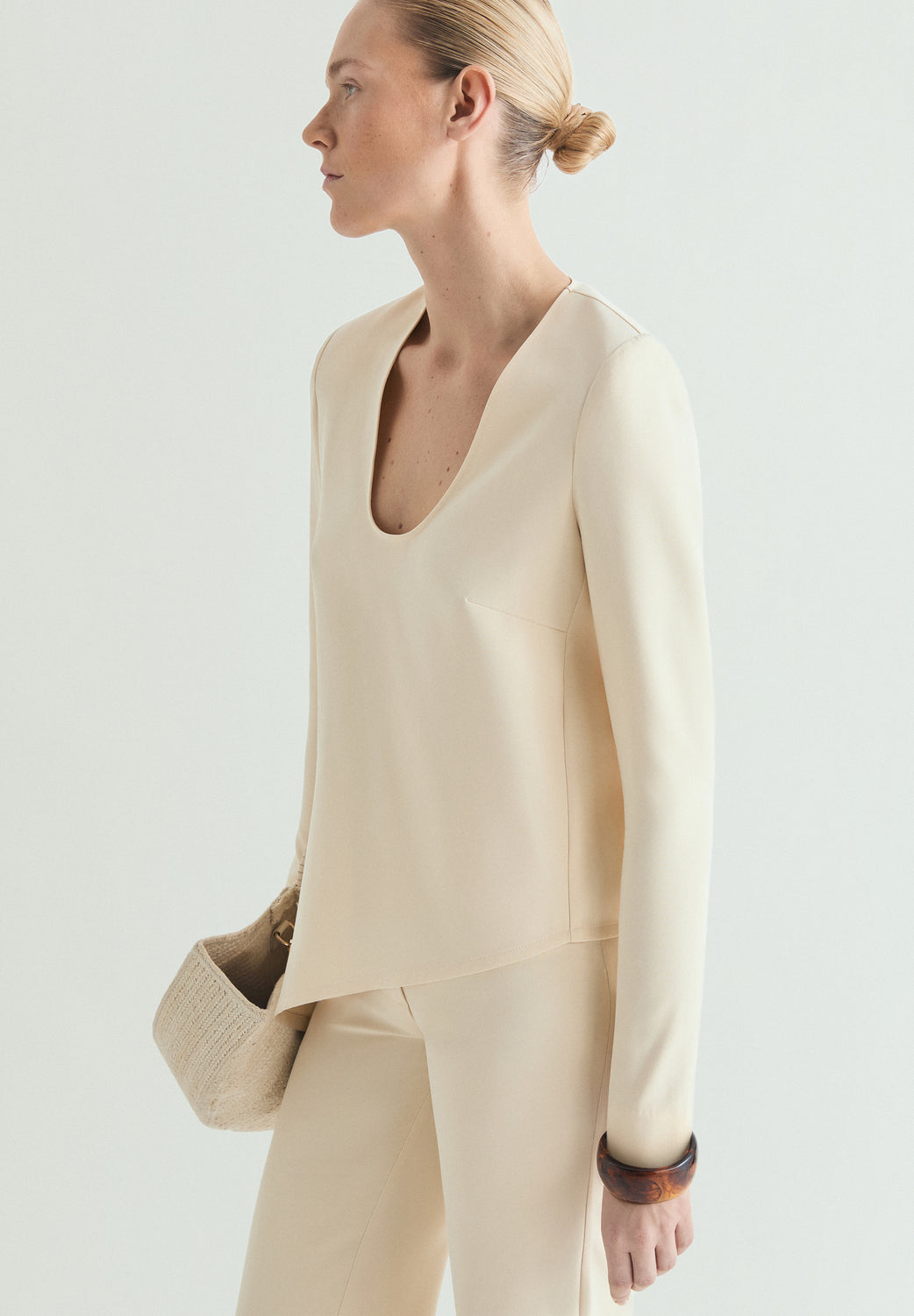 Top confeccionado en tejido fluido. Escote pronunciado y manga larga. Acabado asimétrico en el bajo.