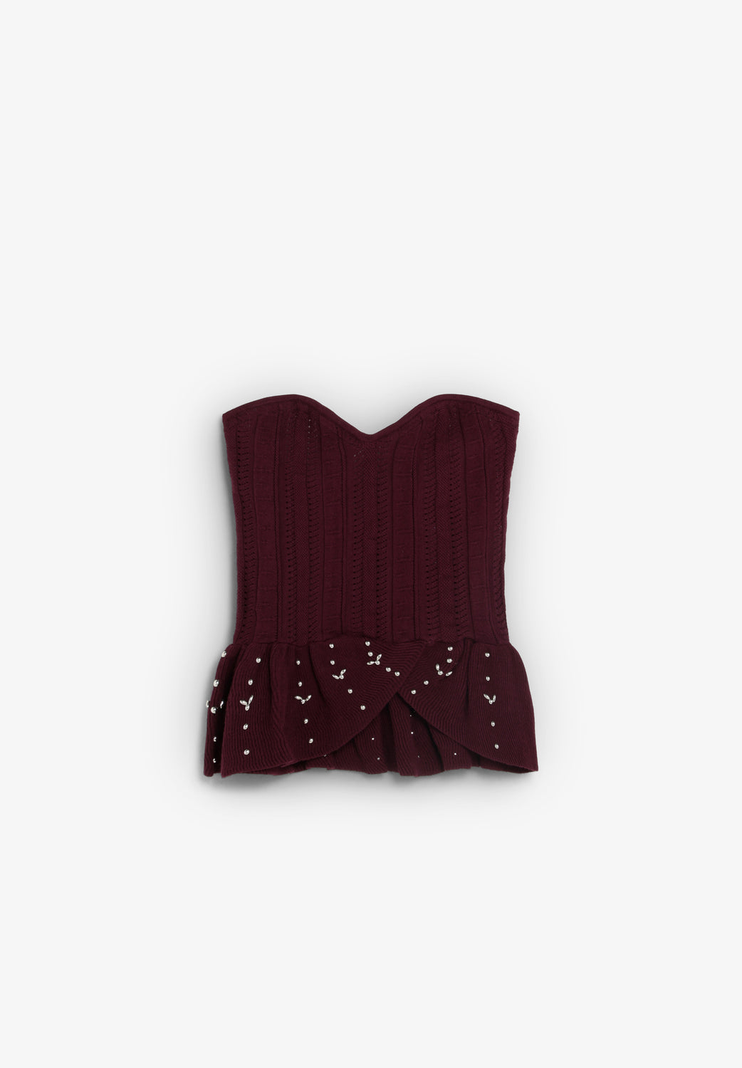 Top estilo peplum, confeccionado en tejido acanalado. Slim fit. Escote en forma de corazón, sin mangas. Volante asimétrico inferior con detalle strass.