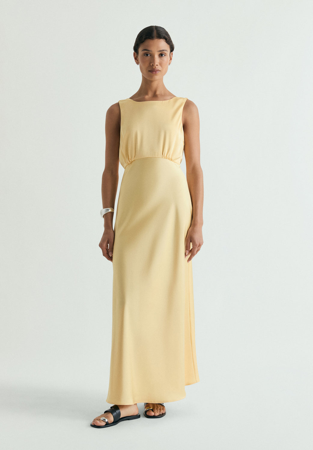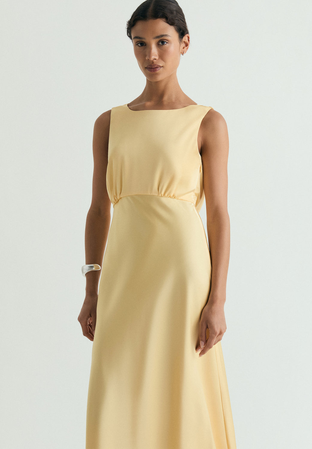 Vestido midi de tejido satinado. Escote amplio y diseño sin mangas. Corte bajo el pecho y falda de caída fluida. Espalda descubierta con detalle drapeado y lazada fina en el cuello. Cierre lateral con cremallera invisible.