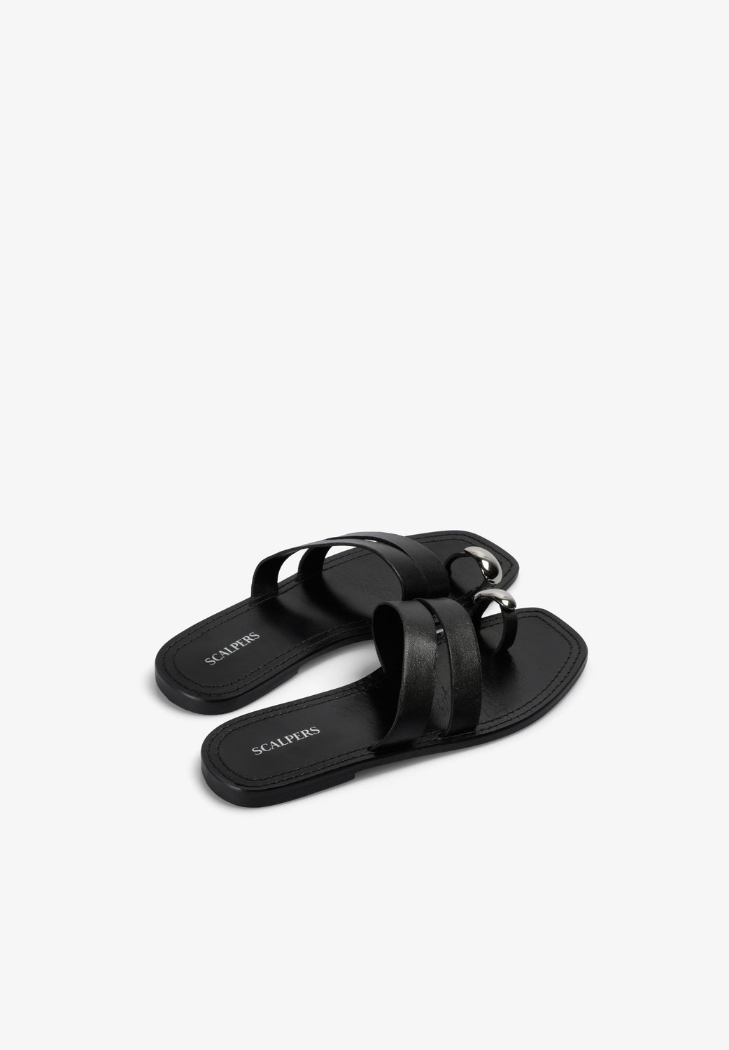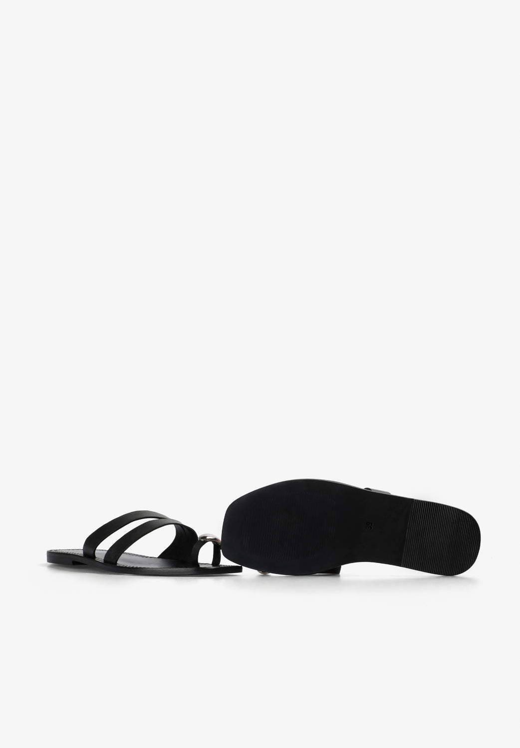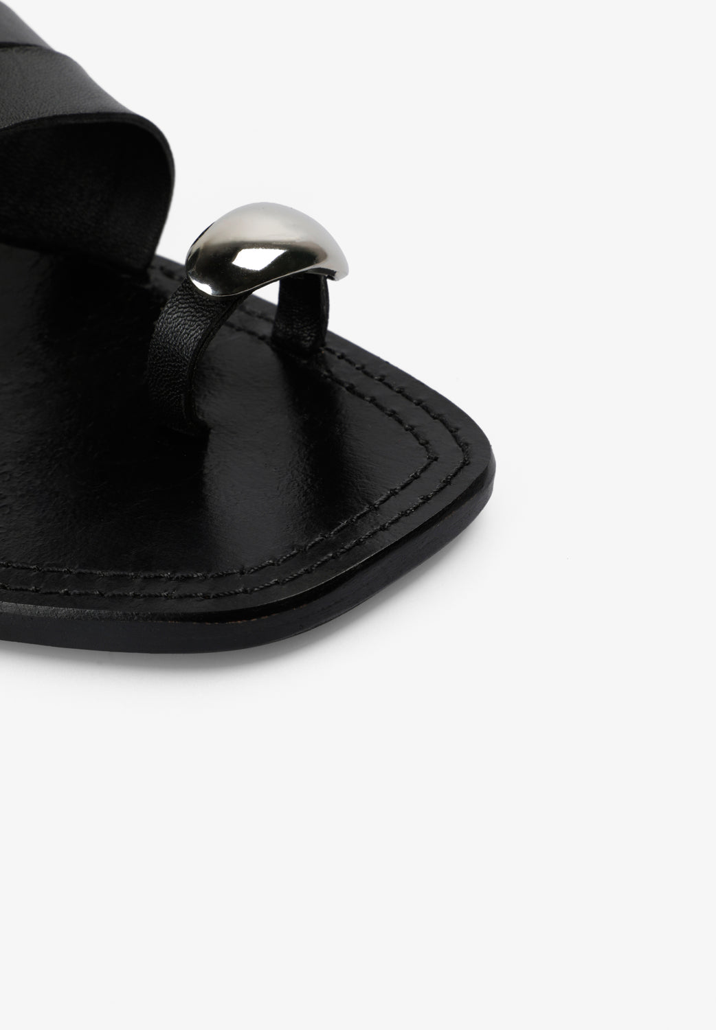 Sandalia plana 100% piel con tiras. Detalle de adorno metálico en el dedo.