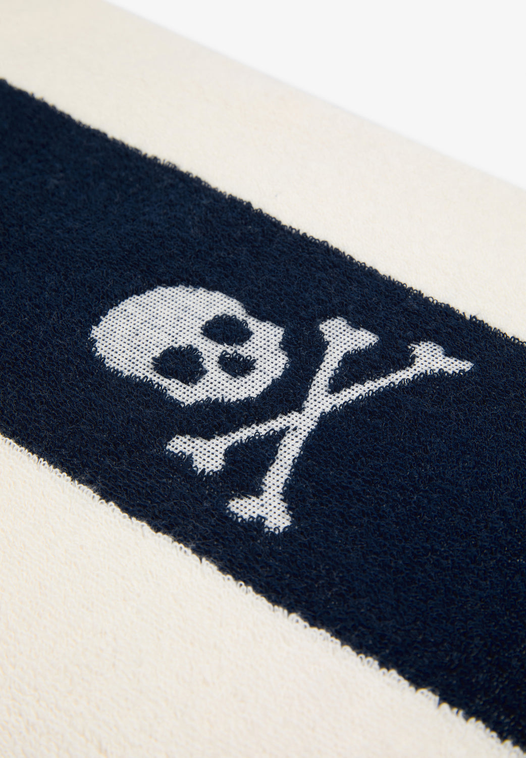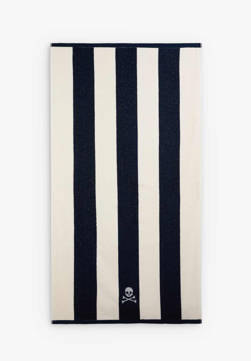 Toalla de playa con estampado de rayas. Calavera bordada a contraste.