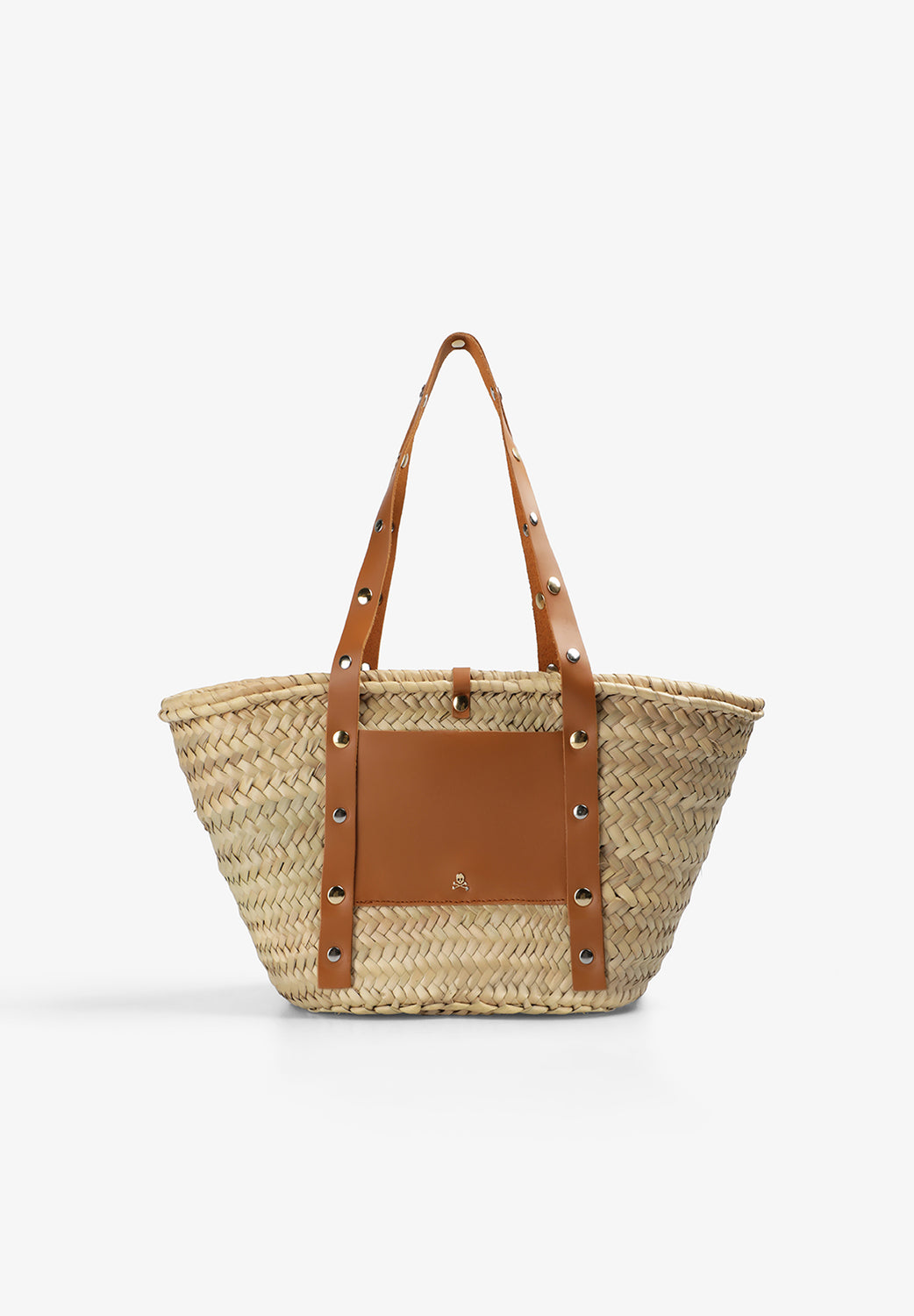Capazo de fibra natural. Doble asa al hombro con detalle de tachuelas. Bolso pequeño de piel interior con enganche. Cierre interior. Detalle de grabado en bolso interior y calavera metálica en lateral.