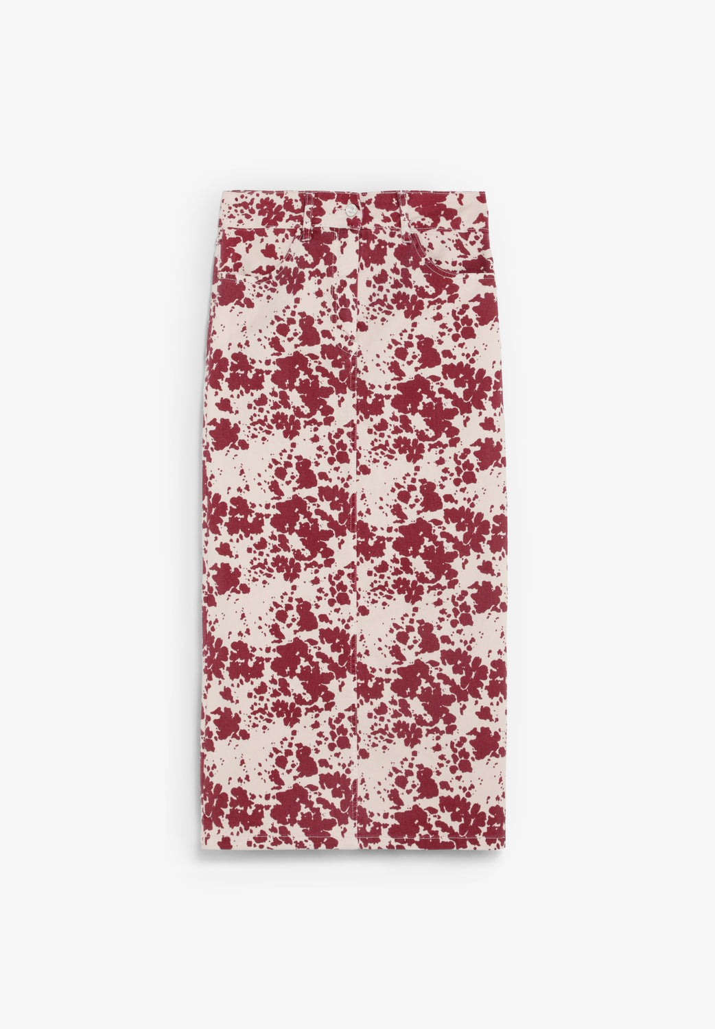 Falda denim confeccionada en algodón BCI ligeramente elástica. Corte regular fit, midi. Estampado animal print. Cierre mediante cremallera y botón. Trabillas en cintura. Bolsillos delanteros y traseros. Abertura trasera.