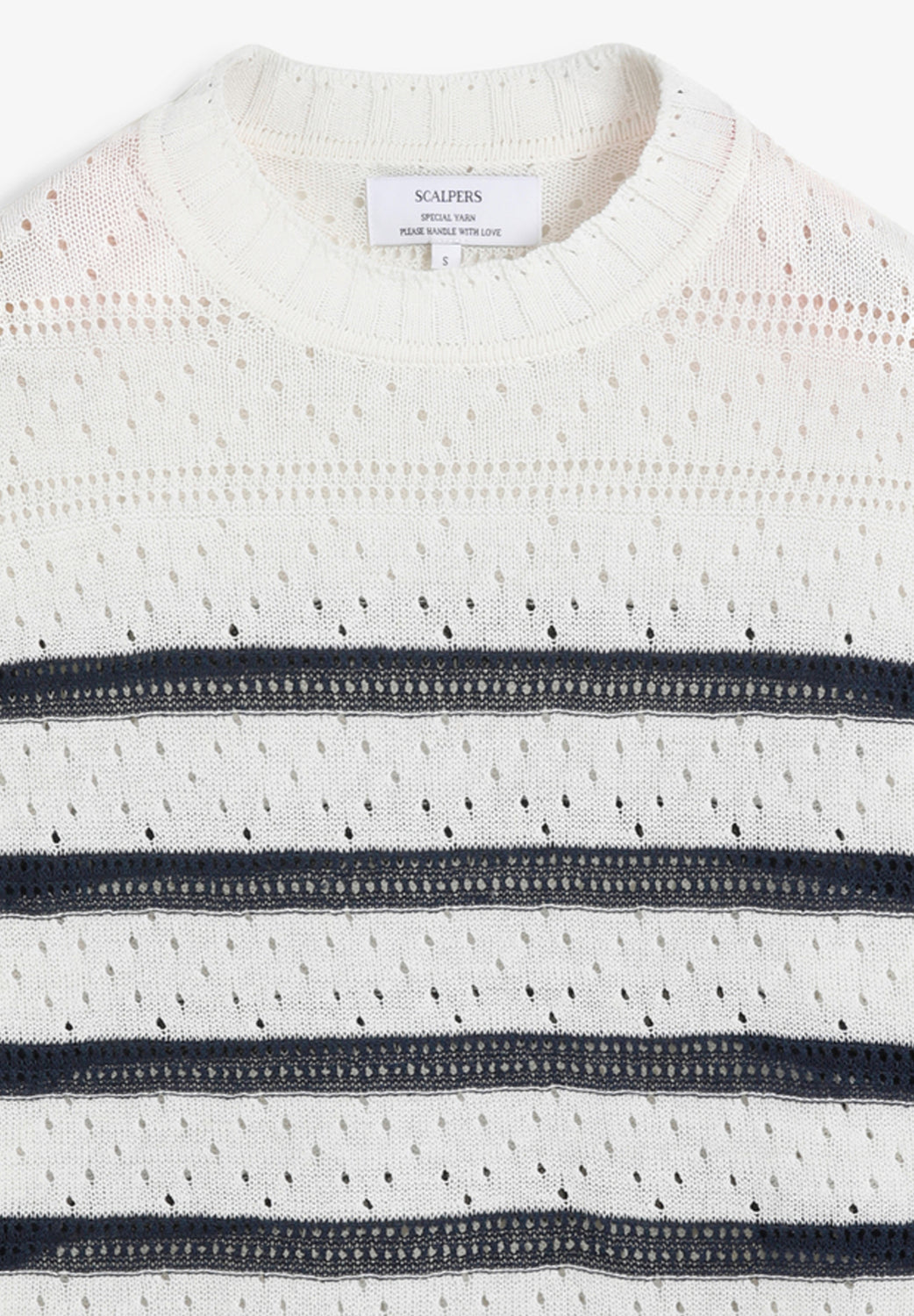 Jersey de punto confeccionado en tejido de punto fino calado con estampado de rayas horizontales. Loose fit. Cuello redondo con acabado festoneado. Mangas largas y puños con punto cerrado y textura de líneas verticales. Bajo con acabado festoneado.