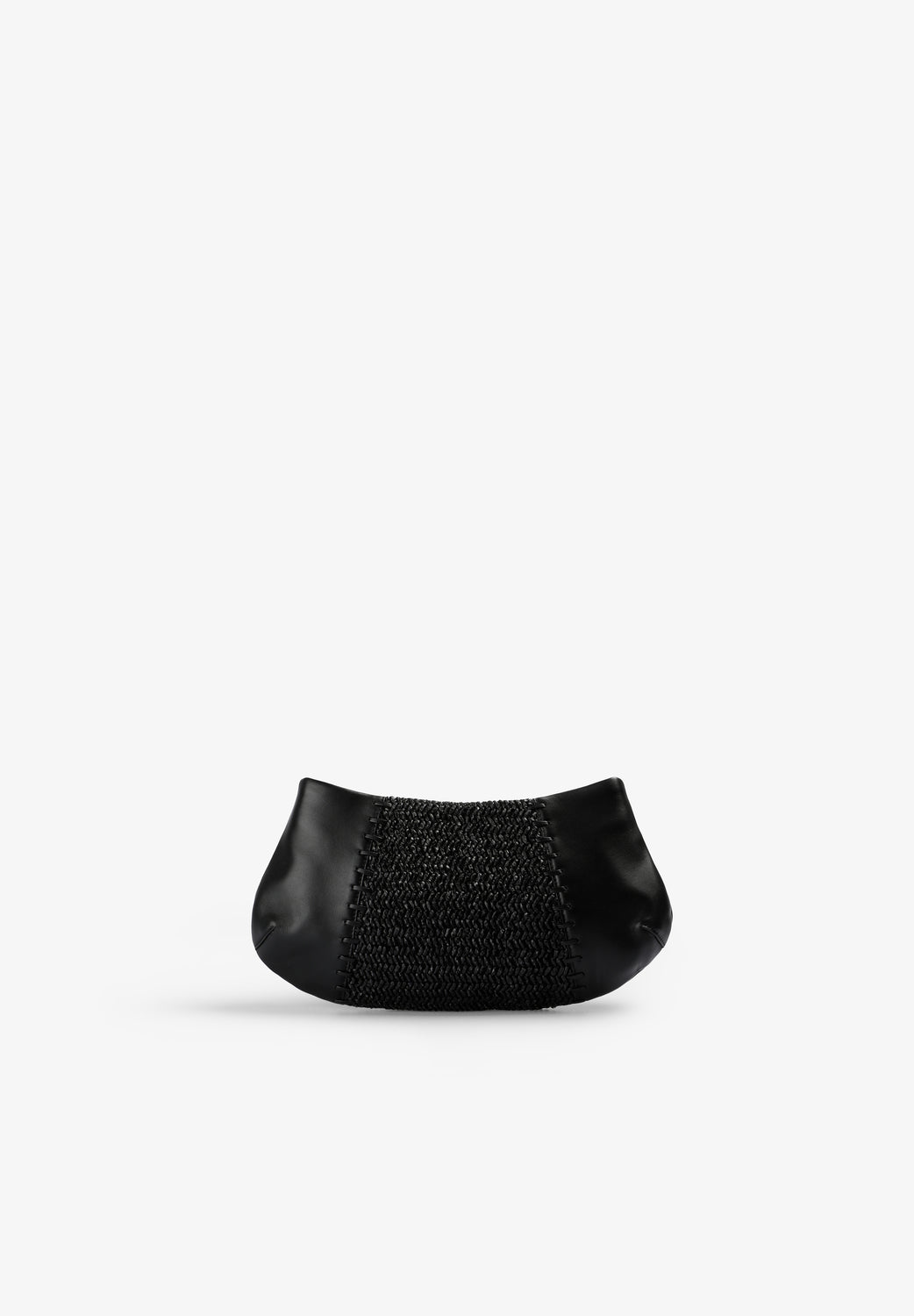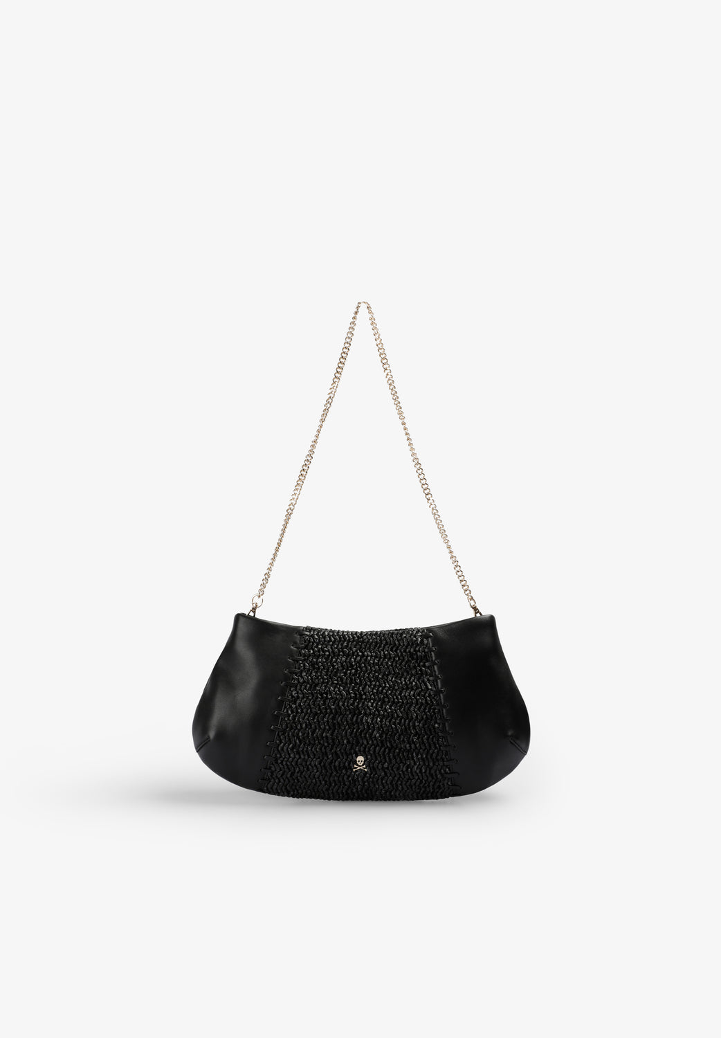 Bolso tipo clutch confeccionado en piel con tejido texturizado. Forro interior. Asa tipo cadena extraíble. Cierre con botón magnético.